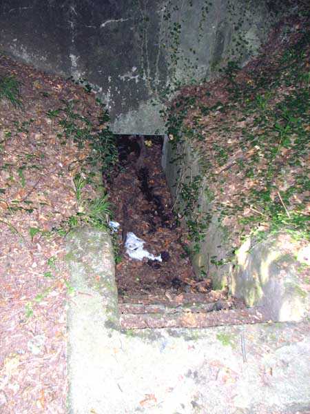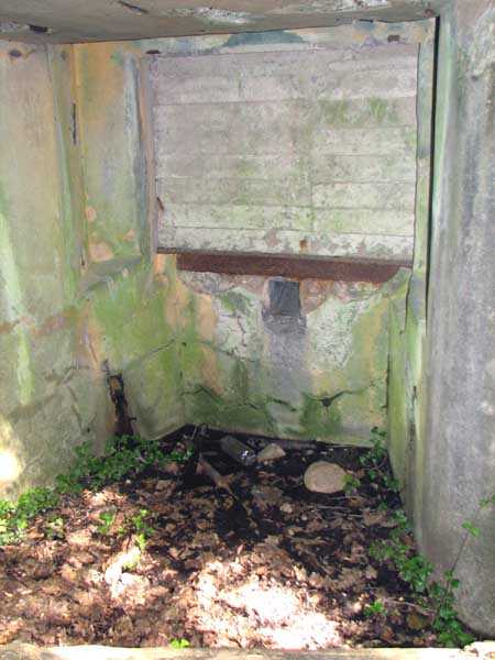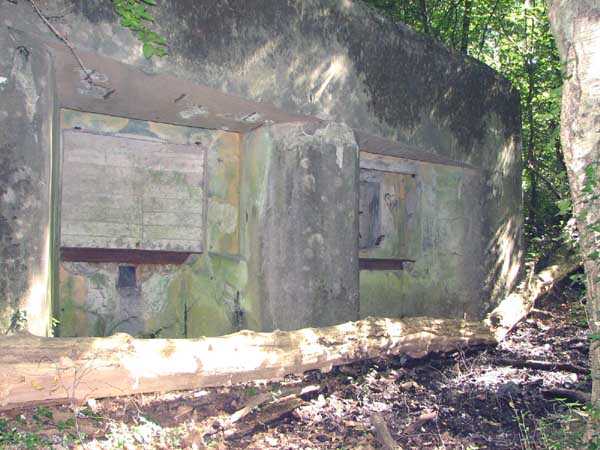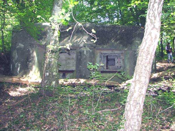 This observation shelter is located in alignment with the fort and the air tower of the fort of Boncelles towards Seraing a short distance from the air tower and apparently on the fort's drainage drain. Its missions consisted of observing on behalf of Fort Boncelles and blocking access through the woods. The cloche has been torn off and the interior of the shelter is cluttered with various waste and pieces of wood. The descent through the cloche hole is perilous as only the top four rungs remain. Normal access, with a cellar entrance, is practically blocked up to the top of the door. Equipment and armament: 1 machine gun on sledge mount and Chardôme support in the embrasure not converted into a grenade launcher chute, 1 light machine gun and a grenade launcher chute for the defense of the entrance airlock, one grenade launcher chute on the left facade, consoles for shelves, hook L1 for the Coleman lamp, hook L2 for individual equipment, hooks L3 for personal weapons, shelf for the cartridge funnel with its metal support. No DN boundary markers (National Defense), no fence around the military area, no closing flaps on the grenade launcher chutes.