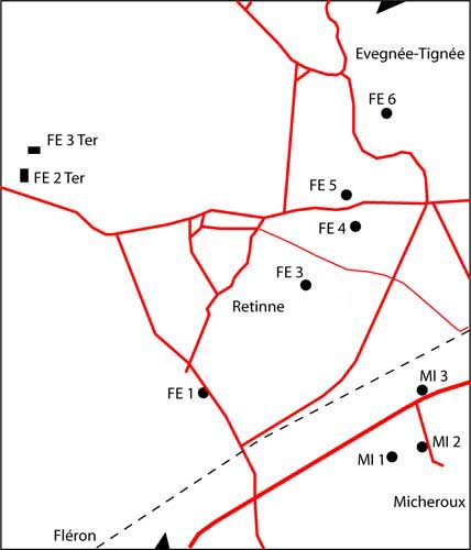 Fortified Position of Liège, second line of resistance. The FPL2 Fléron-Evegnée interval comprises 8 shelters on two defense lines, of which 1 was projected but not built (FE2) and 1 was buried in 2006 (FE5). The rear line is located 1,700 m west-northwest in the locality of Queue-du-Bois.