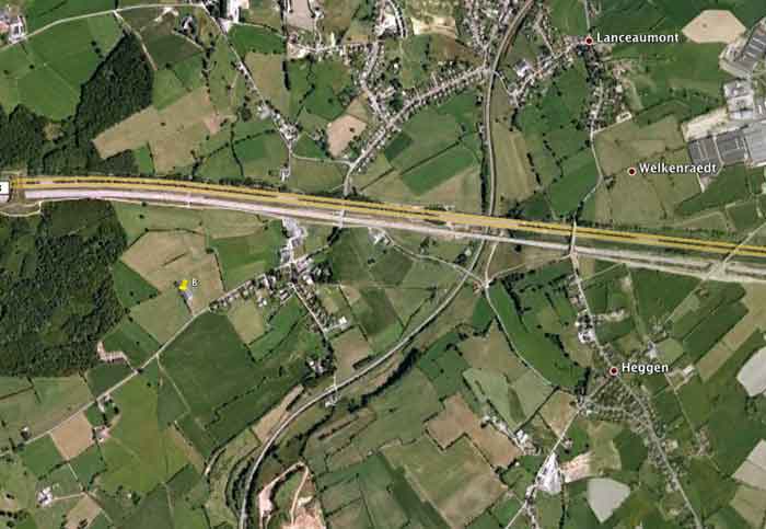 Belgická opevnění z druhé světové války, opevněná pozice Lutychu, první obranná linie, přední postavení Grunhault, srub B typu PA model A, 347 m/n. m., 3 muži. Přední stanoviště Grunhault B se nachází v Meuschmen. Při příjezdu z Welkenraedtu počítejte 600 metrů po projetí pod dálnicí A3/E40 a pod kolejištěm TGV. Úkryt se nachází vpravo na louce, 150 m od silnice a lehce skrytý živým plotem. Zvenku je v dobrém stavu, ale jeho základová deska, která je pod úrovní louky, je často zaplavena. Úkryt slouží jako hřiště pro děti z okolí, které vnitřek pomalovaly barvami podle své chuti. Panty a doraz dveří jsou stále přítomny stejně jako čep pro lafetu Chardôme. Všechno ostatní zmizelo.