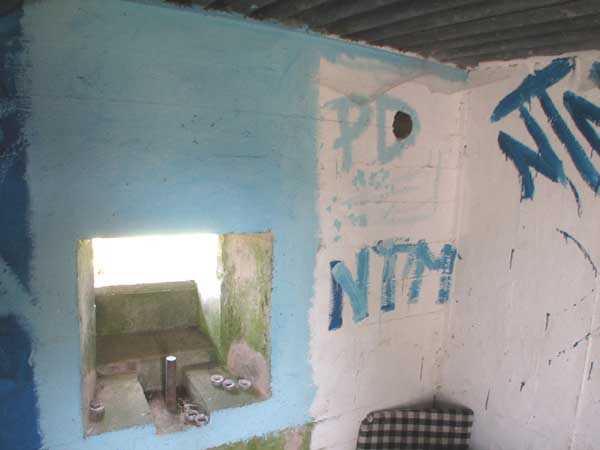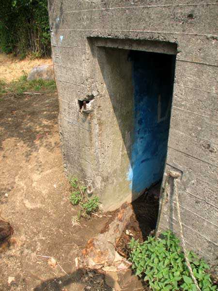 Belgian fortifications of the Second World War, fortified position of Liège, first line of defense, advanced position of Grunhault, B shelter of type PA model A, 347 m/asl, 3 men. The advanced post Grunhault B is located in Meuschmen. Coming from Welkenraedt, count 600 meters after passing under the A3/E40 motorway and under the TGV tracks. The shelter is located in the meadow on the right, 150 m from the road and slightly hidden by the hedge. Externally it is in good condition but its foundation slab being below the level of the meadow is often flooded. The shelter serves as a playground for the neighborhood children who have daubed the interior with colors to their taste. The hinges and the door stop are still present as well as the pivot for the Chardôme mount. Everything else has disappeared.
