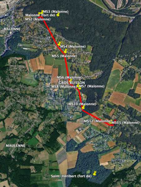 Ce premier segment illustre d’emblée les irrégularités de la position fortifiée : si la distance entre les deux forts est de 3 900 mètres, l’intervalle réellement couvert par les ouvrages de campagne ne s’étend que sur 3 100 mètres. La défense de la partie nord repose sur une ligne unique, calée plus ou moins fidèlement sur le tracé reliant les deux forts. On y dénombre dix ouvrages, dont la nomenclature trahit déjà les premières incohérences de numérotation. La série s’égrène de MS2 à MS8, pour reprendre ensuite de MS10 à MS12. Cette énumération hachée, marquée par l’absence notable de certains numéros, laisse deviner des projets avortés ou des discontinuités dans le plan initial. Aujourd’hui, l’état de conservation de ces abris est tout aussi disparate : si certains subsistent, d’autres sont dans un état de délabrement avancé, et l’un d’entre eux a été totalement rayé de la carte.