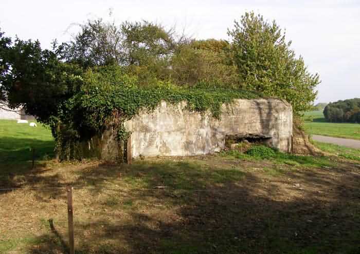 Belgian fortifications of the Second World War, fortified position of Namur, Andoy - Maizeret interval, first line of resistance, shelter 33 of Maizeret, 197 m/asl. Located on the north edge of Rue Ferme Bialy, municipality of Maizeret, entity of Namur, 100 m from the double shelter AM 32 (Loyers). It is a simple interval shelter with one embrasure for a machine gun on the side opposite the entrance, which has an airlock defended by a firing loophole for a light machine gun. In 2023 it was completely overgrown with vegetation and barely discernible.