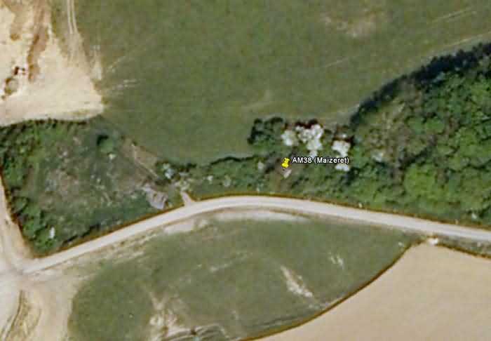 Fortifications belges de la deuxième guerre mondiale, position fortifiée de Namur, intervalle Andoy - Maizeret, première ligne de résistance, légèrement en avant de la ligne des forts, abri 38 de Maizeret, 155 m/alt. Situé au coin du bois, sous les arbres, rue du Samson, commune de Maizeret, entité de Namur, à 50 m à l’est de l’abri AM 37 (Maizeret) et à 240 m au sud du front 3-4 du fort de Maizeret. Il s’agit d’un abri d’intervalle double avec deux embrasures côte à côte pour une mitrailleuse dans la façade opposée à l’entrée munie d’un sas défendu par un créneau pour un fusil-mitrailleur sans affût. En principe il devrait servir d’observatoire au fort de Maizeret et porter en dalle de ciel une cloche cuirassée pour guetteur et fusil-mitrailleur mais nous n’avons pas été en mesure d’établir cette réalité.