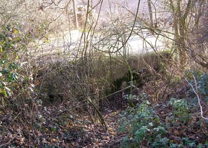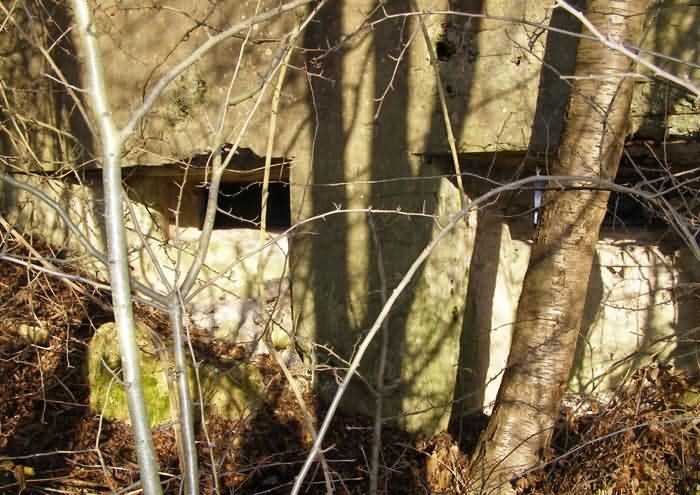 Belgian fortifications of the Second World War, fortified position of Namur, Andoy - Maizeret interval, first line of resistance, slightly in front of the line of forts, shelter 38 of Maizeret, 155 m/asl. Located at the corner of the woods, under the trees, rue du Samson, municipality of Maizeret, entity of Namur, 50 m east of shelter AM 37 (Maizeret) and 240 m south of the 3-4 front of Fort Maizeret. It is a double interval shelter with two side-by-side embrasures for a machine gun in the facade opposite the entrance, which has an airlock defended by a firing loophole for a light machine gun without mount. In principle it should serve as an observatory for Fort Maizeret and carry an armored cupola for lookout and light machine gun on the roof slab, but we were not able to establish this reality.