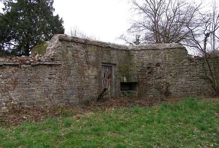 Fortified Position of Namur, Saint-Héribert - Dave interval, shelter 1a of Wépion, 152 m/asl. Located in the curve of Rue du Suary, 35 m north of the crossroads with Allée de Néris, integrated into the wall enclosing the private property. The embrasure for a machine gun or an anti-tank gun on field mounts has been filled with rubble stones identical to those of the wall. The entrance on the embrasure side is closed by a metal door.