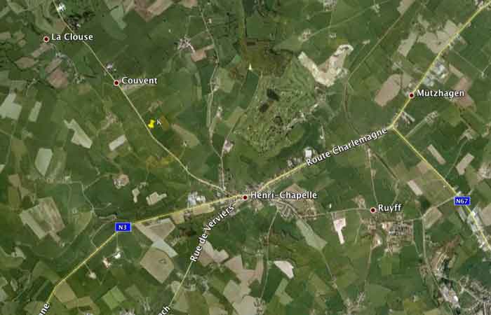 Belgische Festungen des Zweiten Weltkriegs, befestigte Stellung Lüttich, erste Widerstandslinie, vorgeschobene Stellung von Henri-Chapelle, K-Unterstand vom Typ PA Modell B für eine automatische Waffe auf Chardôme-Lafette, 334 M/ü. M., 3 Mann. Der K-Unterstand befindet sich am Straßenrand auf der rechten Seite beim Verlassen des Dorfes in Richtung Aubel vorbei am Denkmal des amerikanischen Friedhofs. Die Struktur ist zwischen den Türpfosten und der Deckenplatte gerissen. Da er auf der Route lag, die von deutschen Truppen auf dem Weg zum Fort Aubin-Neufchâteau benutzt wurde, könnte er unter Artilleriebeschuss während der Offensive gelitten haben. Leer, zugänglich aber verwildert und dient ein wenig als Müllhalde für den Landwirt oder unachtsame Passanten.