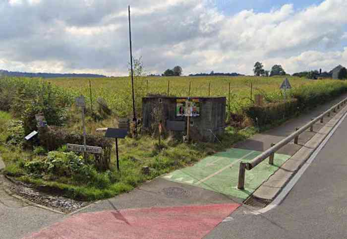 Belgian fortifications of the Second World War, fortified position of Liège, first line of resistance, advanced position of Hombourg, G shelter of type PA model B, 220 m/asl, 3 men, 1 machine gun on Chardôme mount. Located at the crossroads of the N608 rue du Cheval Blanc and the chemin de Hoppish, just before the bridge spanning the railway, it has been erected as a memorial with information panel, Belgian flag and flower pot. The closing shutters of the embrasure are missing but the original door or a door similar to the original is in place and closed, which did not allow visiting the interior. The surroundings are perfectly maintained and the shelter is structurally in good condition. The cycle path laid out in 2025 did not affect it too much although it slightly amputated its space.