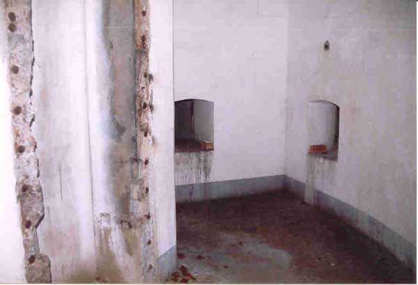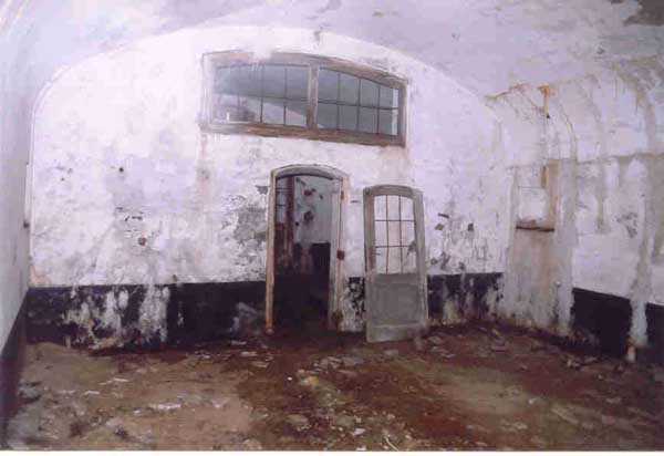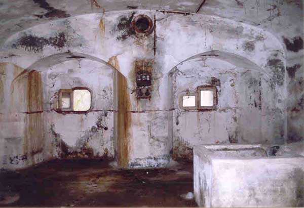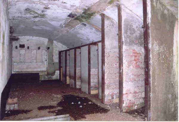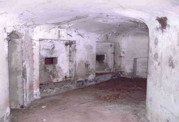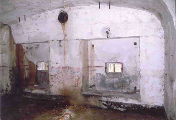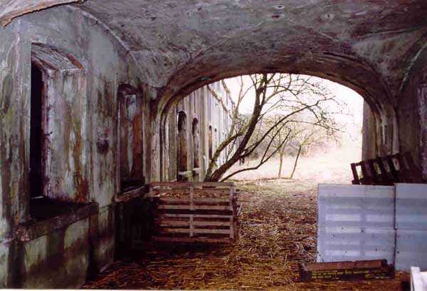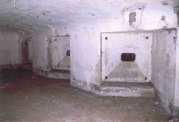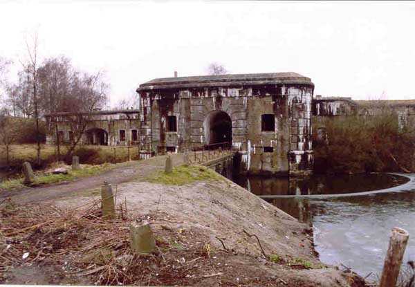 FPA (Fortified Position of Antwerp), outer belt, west-southwest of the city, 20 m/asl, 1902-1914, Brialmont. 1 cupola 2 x 15 c, 2 cupolas 1 x 12 c, 4 cupolas 1 x 7.5 c, 2 turrets for 1 x 5.7 c and, for flanking, 14 x 5.7 c, 4 x 7.5 c, 4 x 12 c and 2 searchlights 90 c. Of the same type as Liezele and Breendonk, the fort of Haasdonk is quite worthy of interest. Indeed, it is the only one whose premises and embrasures were not modified during the Interwar period. Thus, the fortification enthusiast will be satisfied here because the fort is in the state in which it was handed over to the Belgian army in 1912, as indicated by the very faded chronogram on the facade. Although its armored components have all been scrapped, some most interesting fittings remain, including several grilled doors in the powder and projectile magazines. The machine rooms show their two levels and the generator support bases. The overhead crane at the entrance is also the original one. The walls are particularly rich in German inscriptions. This fort has always been very difficult to access and graffiti artists have not been able to exercise their talents there; consequently it is very clean. Currently (02/2006) this fort serves as winter quarters for several hundred bats and is off-limits. Found spelled Haesdonck.