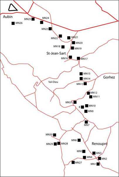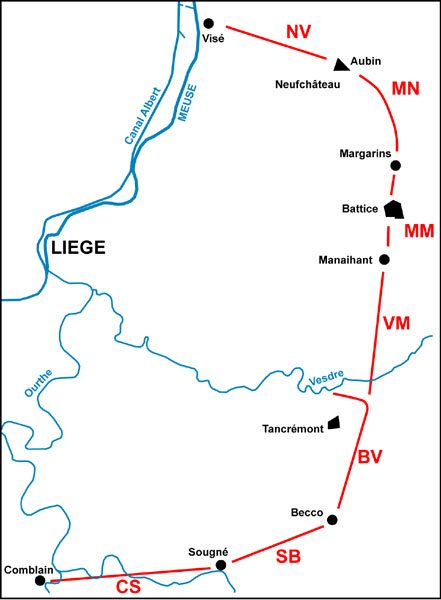 Belgian fortifications of the Second World War, fortified position of Liège, first line of resistance, intervals between the forts of the PFL1 (first line of the fortified position of Liège). Regarding the intervals of the Fortified Position of Liège 1 (PFL1), the spaces must be considered in a counter-clockwise direction from Comblain to Visé. The shelters are also counted in a counter-clockwise direction. There are seven intervals, namely: Comblais-Sougné (CS), Sougné-Becco (SB), Becco-Vesdre (BV), Vesdre-Manaihant (VM), Manaihant-Margarins (MM), Margarins-Neufchâteau (MN), Neufchâteau-Visé (NV). The shelters of this line differ somewhat from those of the advanced positions (PA). They are slightly larger, have an entrance defense with a grid, shutter door, embrasure for a light machine gun, defensive Mills grenade chute. On the enemy side, they generally have an embrasure for a Maxim machine gun on a sleigh mount to be placed on a Chardôme device. They can sometimes have two embrasures for machine guns oriented in the same direction or in different directions. Their resistance index is also reinforced with a roof and enemy-side walls of 1.50 m and friendly-side walls of 80 cm thickness in reinforced concrete.