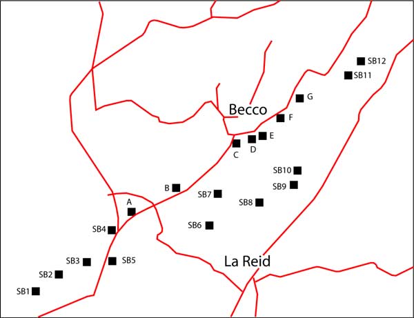 Belgische Befestigungen des Zweiten Weltkriegs, befestigte Stellung Lüttich, erste Widerstandslinie, Zwischenräume zwischen den Forts der PFL1 (erste Linie der befestigten Stellung Lüttich). Was die Zwischenräume der Befestigten Stellung Lüttich 1 (PFL1) betrifft, müssen die Räume im Gegenuhrzeigersinn von Comblain bis Visé betrachtet werden. Die Unterstände werden ebenfalls im Gegenuhrzeigersinn gezählt. Es gibt sieben Zwischenräume, nämlich: Comblais-Sougné (CS), Sougné-Becco (SB), Becco-Vesdre (BV), Vesdre-Manaihant (VM), Manaihant-Margarins (MM), Margarins-Neufchâteau (MN), Neufchâteau-Visé (NV). Die Unterstände dieser Linie unterscheiden sich etwas von denen der vorgeschobenen Stellungen (PA). Sie sind etwas größer, verfügen über eine Eingangsverteidigung mit Gitter, Klapptür, Scharte für ein leichtes Maschinengewehr, defensive Mills-Granatwurfrinne. Auf der Feindseite verfügen sie in der Regel über eine Scharte für ein Maxim-Maschinengewehr auf Schlittenlafette, die auf einer Chardôme-Vorrichtung platziert wird. Sie können manchmal zwei Scharten für Maschinengewehre haben, die in die gleiche Richtung oder in verschiedene Richtungen ausgerichtet sind. Ihr Widerstandsindex ist ebenfalls verstärkt mit einem Dach und feindseitigen Wänden von 1,50 m und freundseitigen Wänden von 80 cm Dicke aus Stahlbeton.