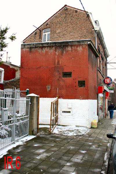 Position Fortifiée de Liège, troisième ligne de résistance, abris de contre-irruption. L'abri IR6, 75 m/alt, situé rue du Couvent, quasiment au coin de la rue de Beyne sur la commune de Jupille-sur-Meuse, est armé d'un créneau pour fusil-mitrailleur au rez-de-chaussée, d'un créneau pour une mitrailleuse et d'un autre pour un projecteur à l'étage. Il semble être en bon état mais nous n'avons pas pu accéder à l'intérieur.