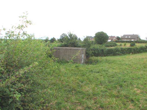 Belgische Festungen des Zweiten Weltkriegs, befestigte Stellung Lüttich, erste Widerstandslinie, vorgeschobene Stellung von Jalhay, E-Unterstand vom Typ PA Modell A, 378 M/ü. M., 3 Mann, 1 Maschinengewehr auf Chardôme-Lafette. Den Nordosten abdeckend, ist sie in einer Weidehecke am Ende eines Hohlwegs gelegen. Schwer zugänglich, konnten wir feststellen, dass ihre originale Tür vorhanden und geschlossen ist. Wir konnten weder zur Scharte noch ins Innere gelangen.