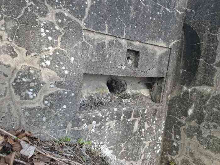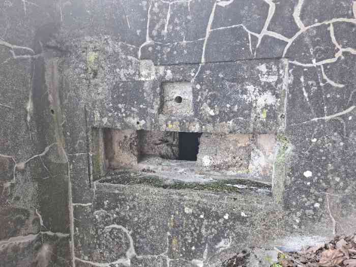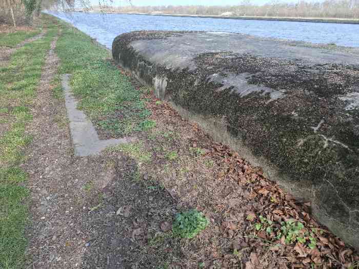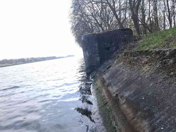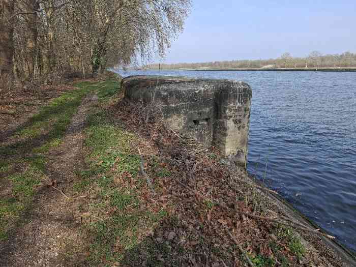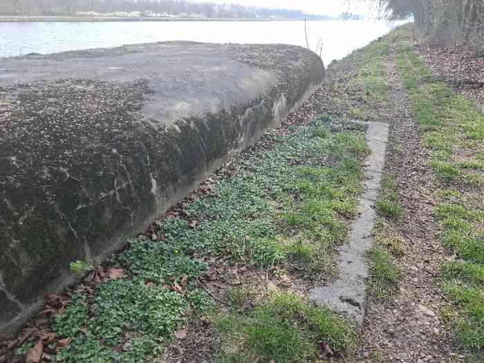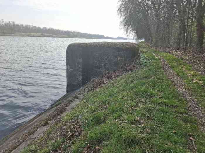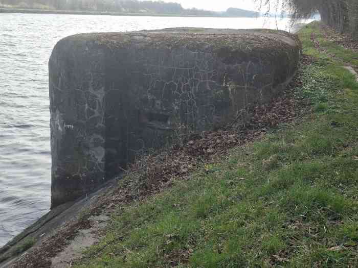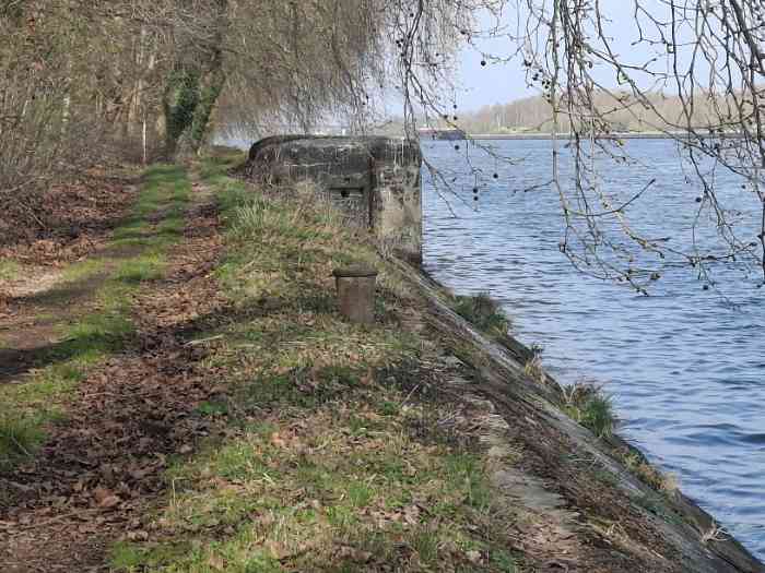Lanaye. Ligne du canal Albert, abris de Lanaye, abri I Canal, 61 m/alt. Situé à la limite nord de la localité de Loën, rive gauche du canal Albert. Il s'agit d'un abri de berge typique avec entrée en cave et deux embrasures opposées pour mitrailleuses. Albertkanal-Linie, Unterstände von Lanaye, Unterstand I Canal, 61 M/ü. M. Gelegen an der Nordgrenze der Ortschaft Loën, linkes Ufer des Albert-Kanals. Es handelt sich um einen typischen Uferunterstand mit Kellereingang und zwei gegenüberliegenden Schießscharten für Maschinengewehre. Lijn van het Albertkanaal, schuilkelder van Lanaye, schuilkelder I Canal, 61 m/TAW. Gelegen aan de noordelijke grens van de plaats Loën, linkeroever van het Albertkanaal. Het betreft een typische oever schuilkelder met kelderingang en twee tegenover elkaar liggende schietgaten voor mitrailleurs. Albert Canal line, Lanaye shelters, shelter I Canal, 61 m/asl. Located at the northern boundary of the locality of Loën, left bank of the Albert Canal. This is a typical riverside shelter with a cellar entrance and two opposite embrasures for machine guns. Linie Albertova kanálu, pěchotní sruby Lanaye, pěchotní srub I Canal, 61 m/n. m. Nacházející se na severní hranici obce Loën, levý břeh Albertova kanálu. Jedná se o typický pobřežní pěchotní srub se sklepním vchodem a dvěma protilehlými střílnami pro kulomety.