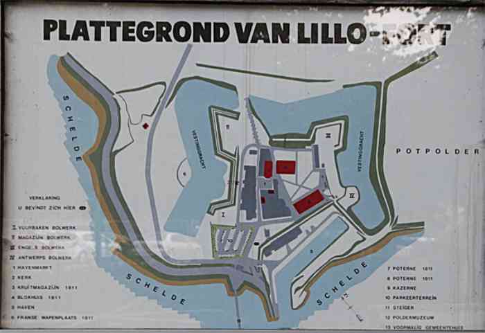 FSA (Versterkte Position Antwerpen). Fort aus der Zeit Napoleon Bonapartes, erbaut 1810 zur Überwachung der Schelde flussabwärts der Stadt Antwerpen. Seine Bastionen sind aus aufgeschütteter Erde. Ein charmantes kleines Städtchen namens Lillo wurde intramuros erbaut. Man kann dort neben zwei kleinen Poternen noch eine Kaserne und ein Pulvermagazin sehen, das sich in Restaurierung befindet. Auf dem Glacis, am Zugangsweg, wurde ein kleiner, quadratischer Blockhaus mit 16 Schießscharten (4 pro Seite) aus dem Jahr 1810 ebenfalls kürzlich restauriert.