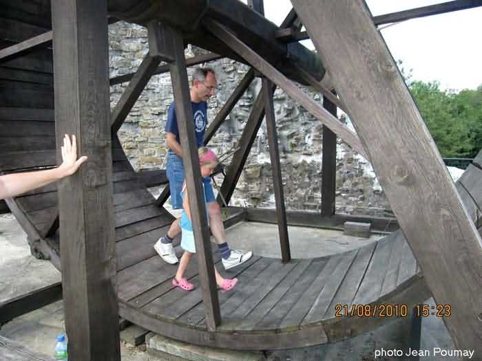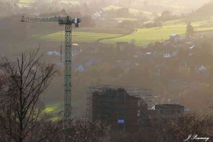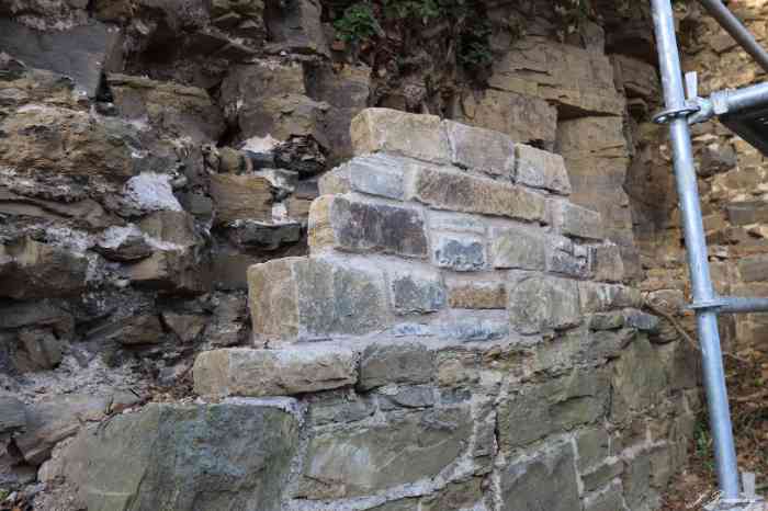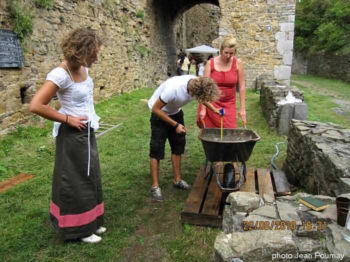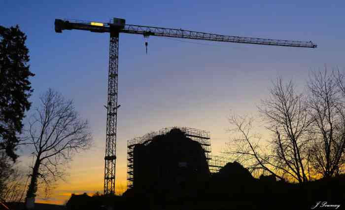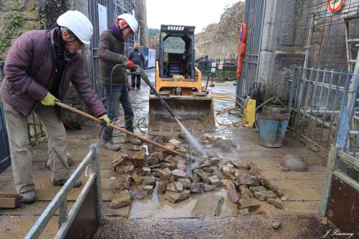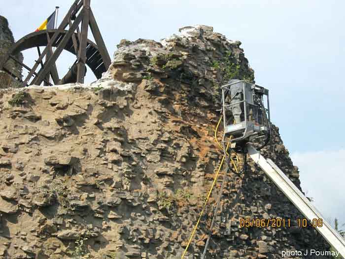 Beautiful sun and beautiful sky at the castle on this 21st and its beautiful scaffolding. Galère carried out the first masonry tests. Stones are being hoisted onto the scaffolding of the bulwark in preparation for the 2026 construction sites. The stones come partly from the moats, recovered by Fred with his trailer and his 4x4, the rest comes via "Bob" from the upper courtyard following the works of Galère and the excavated trenches. They are carefully washed with a high-pressure jet. Installation of the waterproofing membrane that will be masoned in 2026. A duo is preparing the connecting planks of the "bulwark" scaffolding. We were 11 in the morning and at the apéro, a little less in the afternoon.