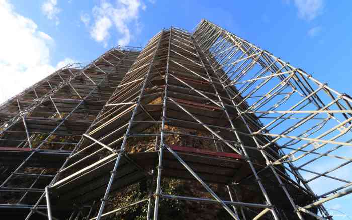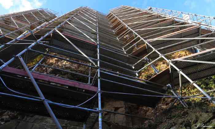 Beau soleil et beau ciel au château ce 21 et son bel échafaudage. Galère a fait les premiers test de maçonnerie. Montée de pierres sur l'échafaudage du balloir en vue des chantiers de 2026. les pierres proviennent en partie des fossés, récupérés par Fred avec sa remorque et son ti 4/4, le reste vient via "Bob" de la haute cour suite aux travaux de Galère et les tranchées creusées. Elles sont lavées avec soins au jet haute pression. Pose de la membrane d'étanchéité qui sera maçonnée en 2026. Un duo prépare les planches de jonction de l'échafaudage "balloir". Nous étions 11 le matin et à l'apéro, un peu moins l'après midi.