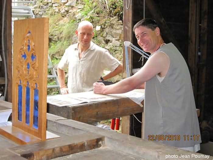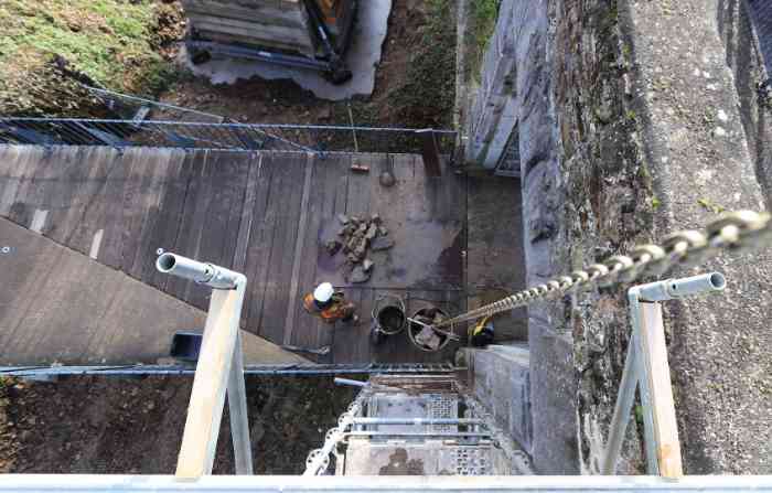 Schöne Sonne und schöner Himmel auf der Burg an diesem 21. und ihr schönes Gerüst. Galère hat die ersten Mauerwerktests durchgeführt. Steine werden auf das Gerüst des Bollwerks hochgezogen, für die Baustellen 2026. Die Steine stammen teilweise aus den Gräben, von Fred mit seinem Anhänger und seinem Land Rover geborgen, der Rest kommt per "Bob" vom oberen Burghof nach den Arbeiten von Galère und den ausgehobenen Gräben. Sie werden sorgfältig mit Hochdruck gereinigt. Verlegen der Abdichtungsmembran, die 2026 vermauert wird. Ein Duo bereitet die Verbindungsbretter für das "Bollwerk"-Gerüst vor. Wir waren morgens und beim Apéro 11, am Nachmittag etwas weniger.