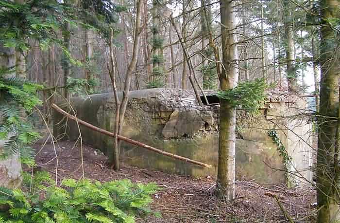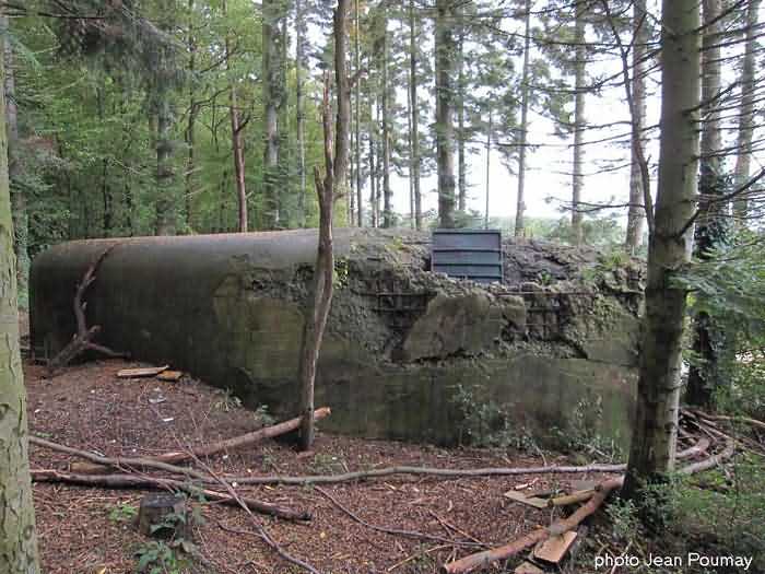 Fortified Position of Namur, Malonne - Saint-Héribert interval, shelter 7 of Malonne, 212 m/asl. Located opposite 64 Chemin des Trois Fortins, at the entrance of a forest path under thick vegetation, its presence is barely discernible. It is an interval shelter with one embrasure for a machine gun whose cupola for lookout and light machine gun has been torn off, not without damage. The Chardôme gun mount support, the brackets for shelves and the flaps of the grenade chutes remain. Serves as a storage area for bulky waste.