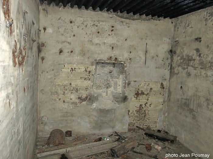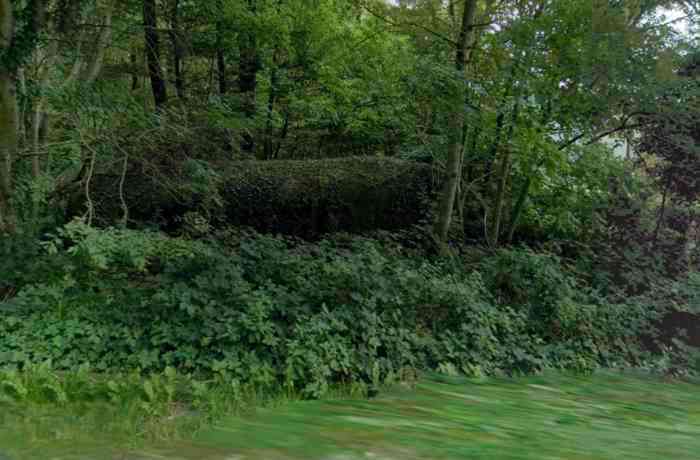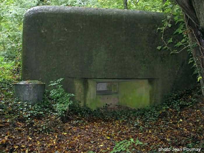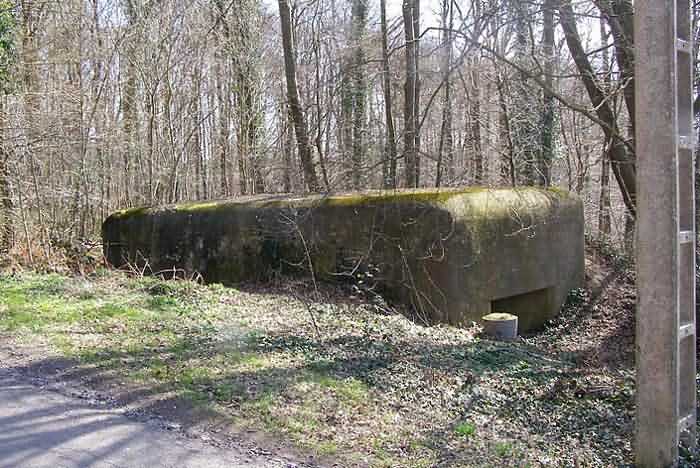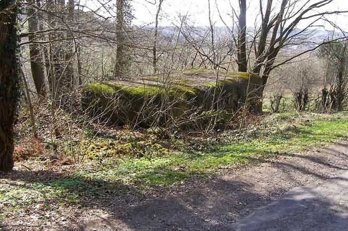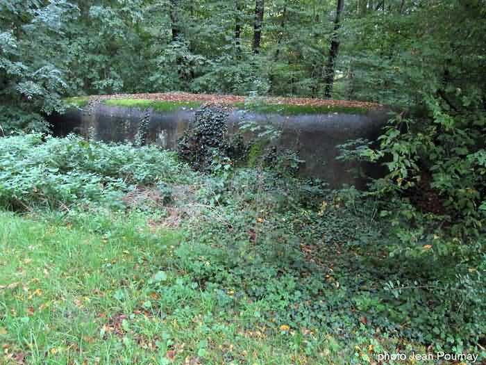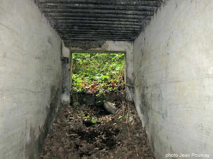 Fortified Position of Namur, Malonne - Saint-Héribert interval, shelter 10 of Malonne, 193 m/asl. Located at 33 Chemin de Wépion, place called Gros-Buisson, municipality of Malonne, entity of Namur, in the undergrowth under a clump of trees and exuberant vegetation. It is a frontal shelter with an embrasure for a machine gun or an anti-tank gun on a field mount. The embrasure is walled up and the entrance is almost completely blocked by landslide material. We found no metal parts there. At the north-west corner of the shelter there remains a fixing post for a Cointet barrier but without its neighbor on the other side of the road. The exterior is covered with moss, the interior reveals some fixing meshes of the cementing.