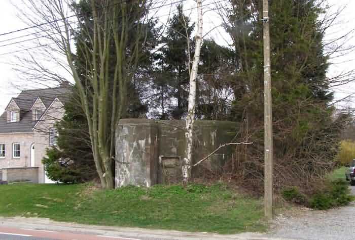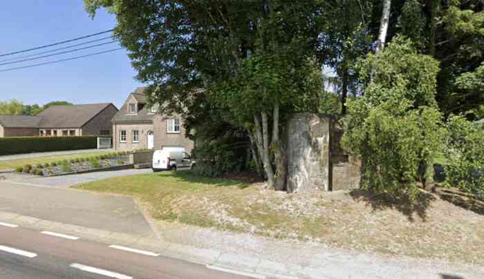 Belgian fortifications of the Second World War, fortified position of Namur, Suarlée - Malonne interval, single line of resistance, shelter SM 5/SS 9 (Suarlée), 174 m/asl. Located on the north edge at number 164 of the Chaussée de Nivelle, 170 m east-northeast of the crossroads with Rue de la Grotte, municipality of Suarlée, entity of Namur, it is a simple flanking interval shelter with an embrasure for a machine gun. In the facade opposite the shield is the entrance with an airlock defended by a firing loophole for a light machine gun without mount and a grenade chute, as well as the emergency exit communicating directly with the firing room. It is in relatively good condition and out of danger as long as the owners of the plot on which it occupies the front do not decide to sell it.