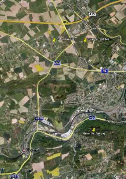 Fortifications belges de la deuxième guerre mondiale, position fortifiée de Namur, intervalle Suarlée - Malonne, ligne unique de résistance, abri SM 7/SS 11 (Suarlée), 171 m/alt. Situé sous un bouquet d’arbres, dans l’angle nord de la Rue du Château de Suarlée et de la Rue de Zualart, commune de Suarlée, entité de Namur, il s’agit d’un abri d’intervalle simple flanquant avec une embrasure pour une mitrailleuse. Dans la façade opposée au bouclier se trouve l’entrée munie d’un sas défendu par un créneau pour un fusil-mitrailleur sans affût et une goulotte lance-grenades ainsi que l’issue de secours communiquant directement avec la chambre de tir. Usage et état de conservation inconnus.