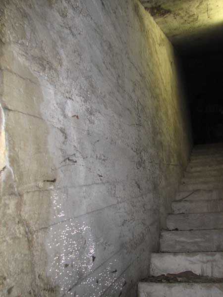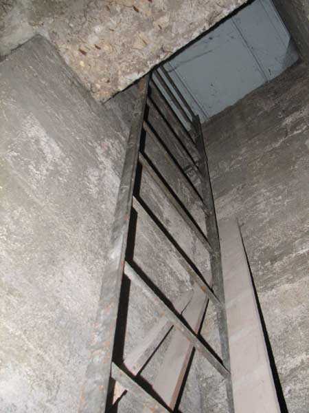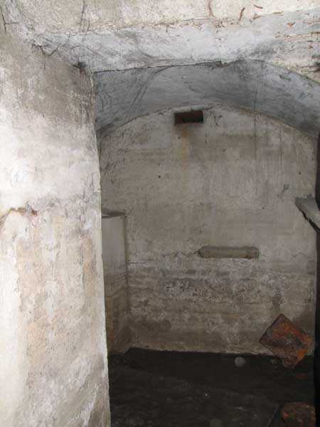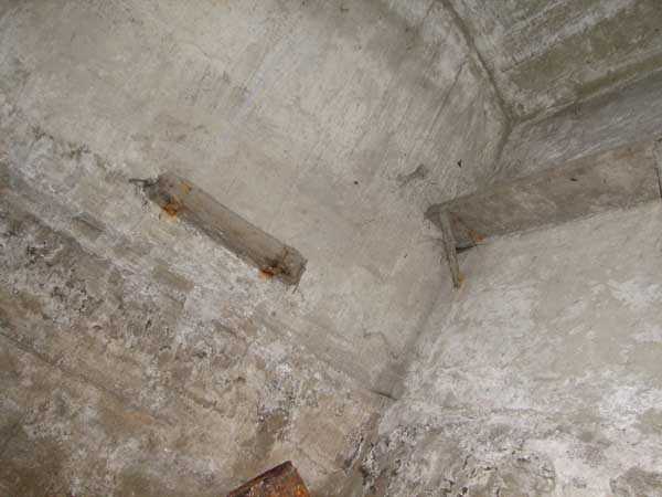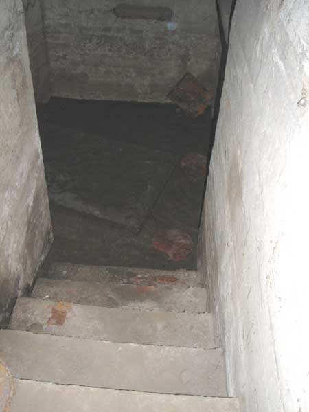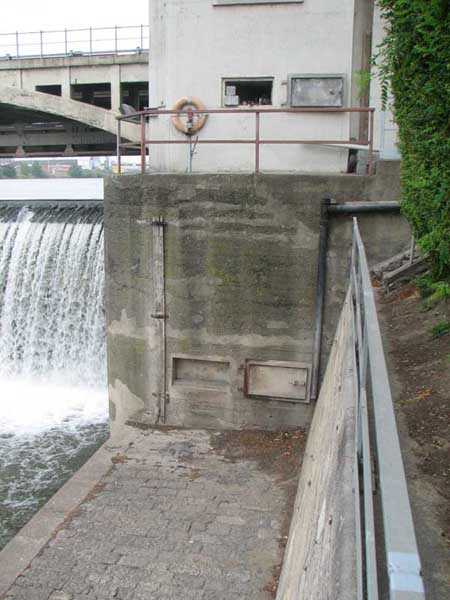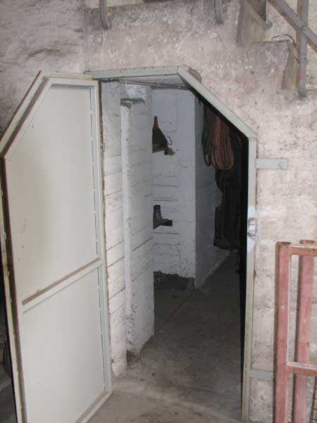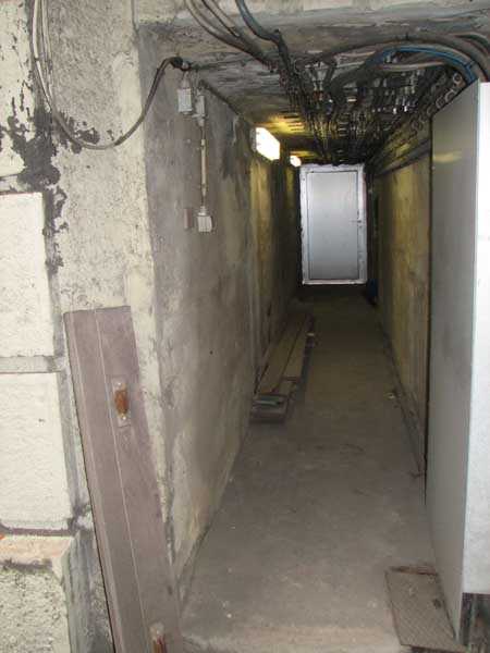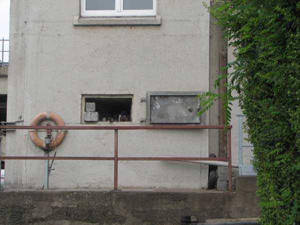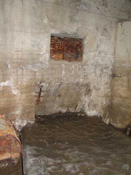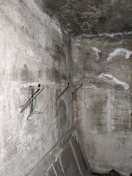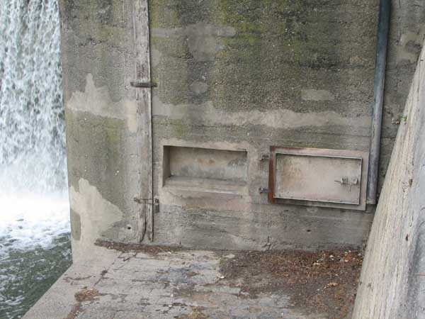 Fortified Position of Liège, fourth line of resistance, shelters of Île Monsin and the Meuse bridges, shelter MeMo2, 59 m/asl. Located on the left bank of the Meuse, on the islet that separates the dam bridge from the power plant, it is accessible via a labyrinth of corridors, stairs and wall ladders in the control building of the dam gates. It has an embrasure, still fitted with its pivoting closing shutter, for a machine gun on a tripod planted in a clay tray on the upper floor and a walled-up embrasure, also fitted with its pivoting closing shutter, for a light machine gun on the lower floor. Still locked, this shelter, which serves as equipment storage for the power plant staff, still possesses practically all its metallic elements. The lower firing chamber is regularly flooded.