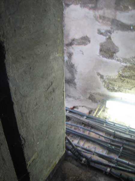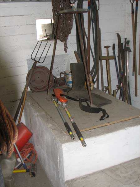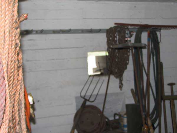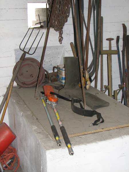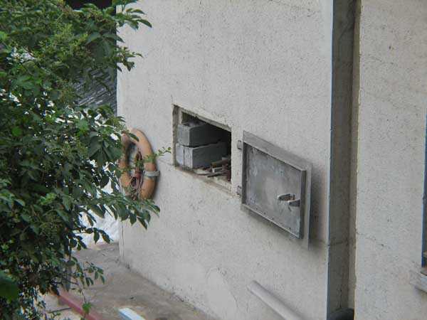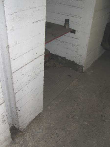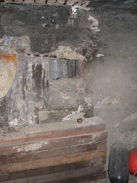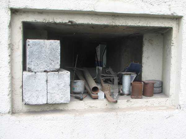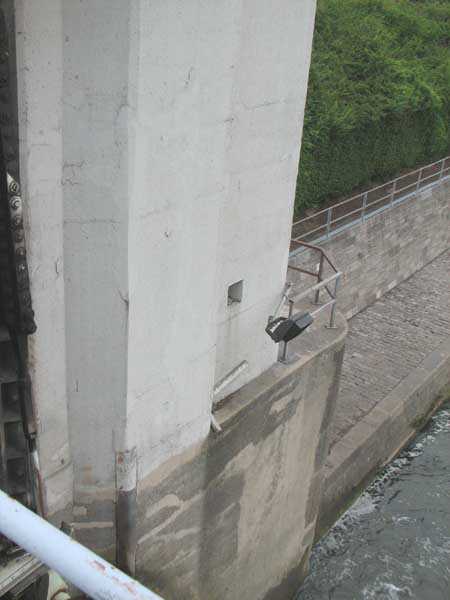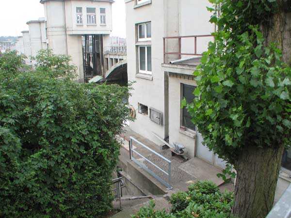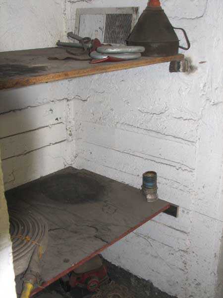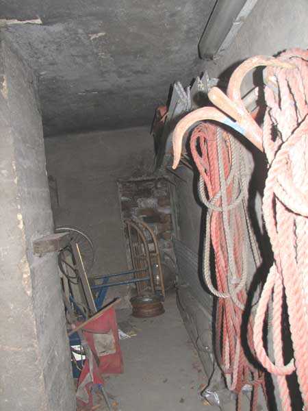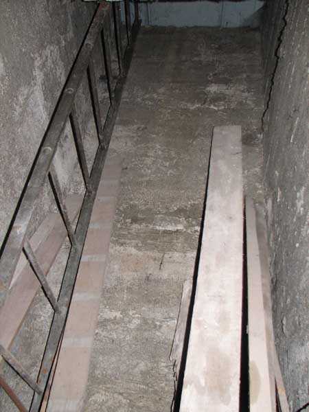 Fortified Position of Liège, fourth line of resistance, shelters of Île Monsin and the Meuse bridges, shelter MeMo2, 59 m/asl. Located on the left bank of the Meuse, on the islet that separates the dam bridge from the power plant, it is accessible via a labyrinth of corridors, stairs and wall ladders in the control building of the dam gates. It has an embrasure, still fitted with its pivoting closing shutter, for a machine gun on a tripod planted in a clay tray on the upper floor and a walled-up embrasure, also fitted with its pivoting closing shutter, for a light machine gun on the lower floor. Still locked, this shelter, which serves as equipment storage for the power plant staff, still possesses practically all its metallic elements. The lower firing chamber is regularly flooded.