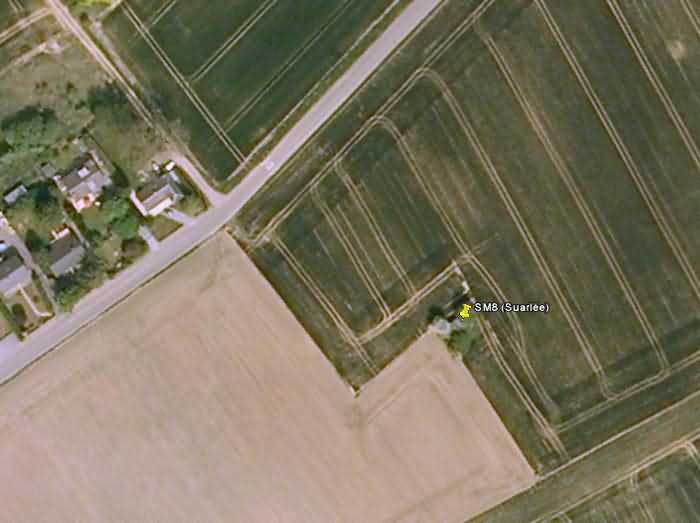 Fortifications belges de la deuxième guerre mondiale, position fortifiée de Namur, intervalle Suarlée - Malonne, ligne unique de résistance, abri SM 8/SS 12 (Suarlée), 168 m/alt. Situé sous un bouquet d’arbres, à 900 m de l’endroit où se trouvait le saillant 1 du fort de Suarlée, à 80 m au sud-est de la Rue Zualart, commune de Suarlée, entité de Namur, il s’agit d’un abri d’intervalle simple flanquant avec une embrasure pour une mitrailleuse. Dans la façade opposée au bouclier se trouve l’entrée munie d’un sas défendu par un créneau pour un fusil-mitrailleur sans affût et une goulotte lance-grenades ainsi que l’issue de secours communiquant directement avec la chambre de tir. Il était camouflé en bâtiment annexe pour exploitation agricole avec une empreinte au sol carrée, des murs en maçonnerie de briques et un toit à deux pans dont il reste juste la moitié de l’un des murs d’une seule façade, le reste ayant probablement été récupéré par les riverains pour leur usage personnel.
