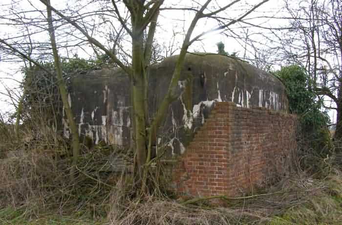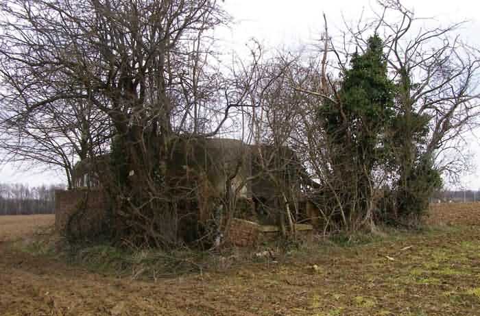 Belgian fortifications of the Second World War, fortified position of Namur, Suarlée - Malonne interval, single line of resistance, shelter SM 8/SS 12 (Suarlée), 168 m/asl. Located under a clump of trees, 900 m from where salient 1 of Fort Suarlée was, 80 m southeast of Rue Zualart, municipality of Suarlée, entity of Namur, it is a simple flanking interval shelter with an embrasure for a machine gun. In the facade opposite the shield is the entrance with an airlock defended by a firing loophole for a light machine gun without mount and a grenade chute, as well as the emergency exit communicating directly with the firing room. It was camouflaged as an outbuilding for a farm, with a square footprint, brick masonry walls and a gabled roof, of which only half of one of the walls of a single facade remains, the rest having probably been recovered by local residents for their personal use.