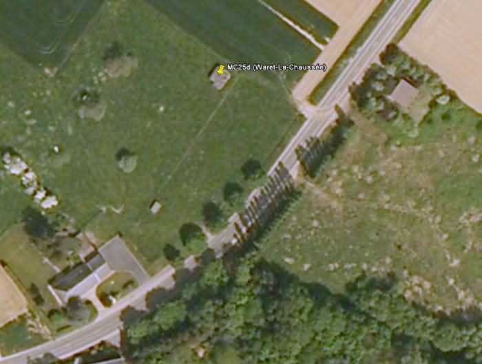 Fortifications belges de la deuxième guerre mondiale, position fortifiée de Namur, intervalle Marchovelette - Cognelée, première ligne de résistance, abri MC 25d/CM 4bis de Waret-La-Chaussée, 202 m/alt. Situé route de Champlon, dans un pré, à 80 m au nord-est de l’abri MC 25/CM 4, il s’agit d’un abri d’intervalle double flanquant avec deux embrasures pour une mitrailleuse. Dans la façade opposée au bouclier se trouve l’entrée munie d’un sas défendu par un créneau pour un fusil-mitrailleur sans affût et une goulotte lance-grenades ainsi que l’issue de secours communiquant directement avec la chambre de tir la plus éloignée du bouclier. En dalle de ciel il portait une cloche cuirassée pour guetteur et fusil-mitrailleur arrachée depuis par des ferrailleurs. En dehors du trou béant, en toiture, il est dans un état de conservation acceptable.
