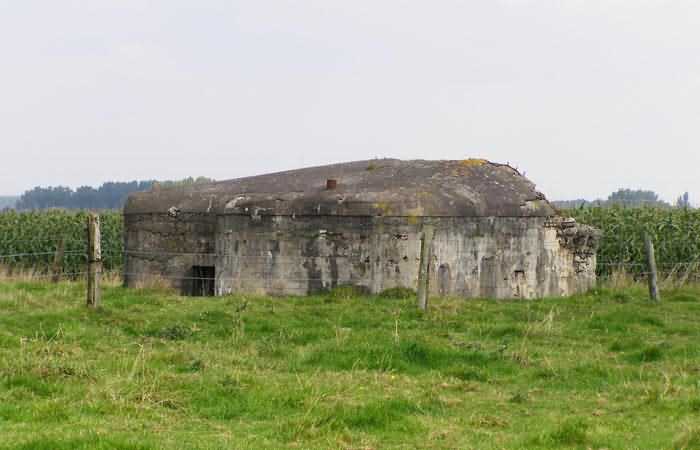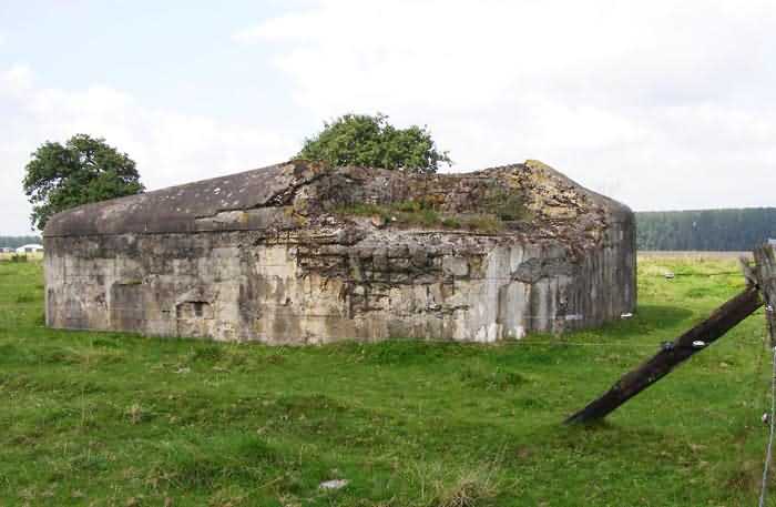 Belgian fortifications of the Second World War, fortified position of Namur, Marchovelette - Cognelée interval, first line of resistance, shelter MC 25d/CM 4bis of Waret-La-Chaussée, 202 m/asl. Located on Route de Champlon, in a meadow, 80 m northeast of shelter MC 25/CM 4, it is a double flanking interval shelter with two embrasures for a machine gun. In the facade opposite the shield is the entrance with an airlock defended by a firing loophole for a light machine gun without mount and a grenade chute, as well as the emergency exit communicating directly with the firing room farthest from the shield. On the roof slab it carried an armored cupola for lookout and light machine gun, since torn off by scrap metal scavengers. Apart from the gaping hole in the roof, it is in an acceptable state of preservation.