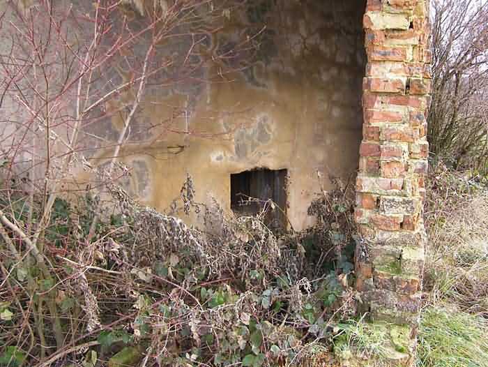 Belgian fortifications of the Second World War, fortified position of Namur, Marchovelette - Cognelée interval, first line of resistance, shelter MC 29/CM 8 (Gelbressée), 196 m/asl, located in the middle of a field east-southeast of Marchovelette in the municipality of Gelbressée, entity of Namur, it is a flanking interval shelter with an embrasure for a machine gun in the facade opposite the entrance, which has an airlock and is defended by a firing loophole for a light machine gun without mount, as well as an emergency exit in the firing room. It is of atypical construction similar to shelter MM 32ter but dressed with bricks and rubble stone to give it the appearance of an agricultural outbuilding. Its camouflage has suffered quite a lot from the passage of time.