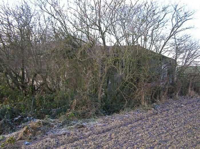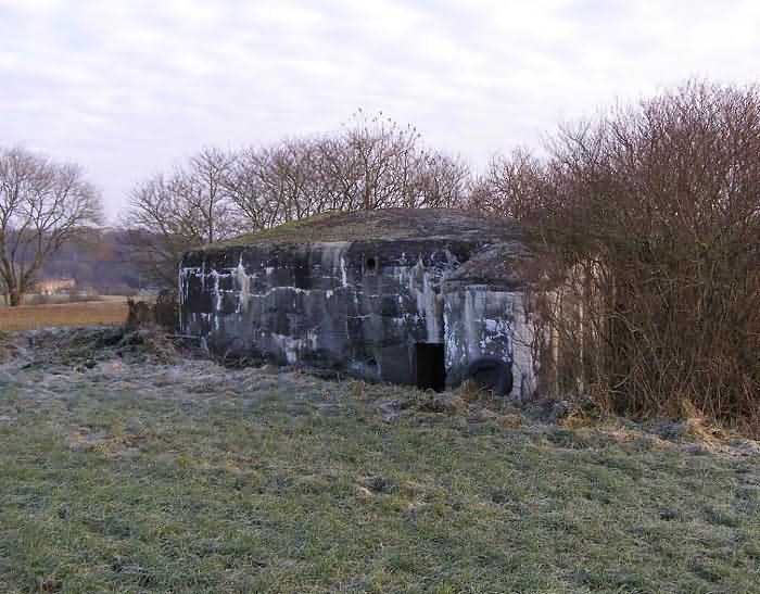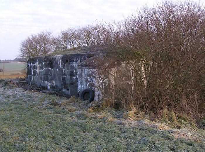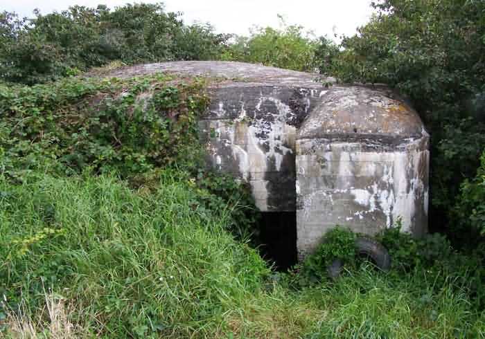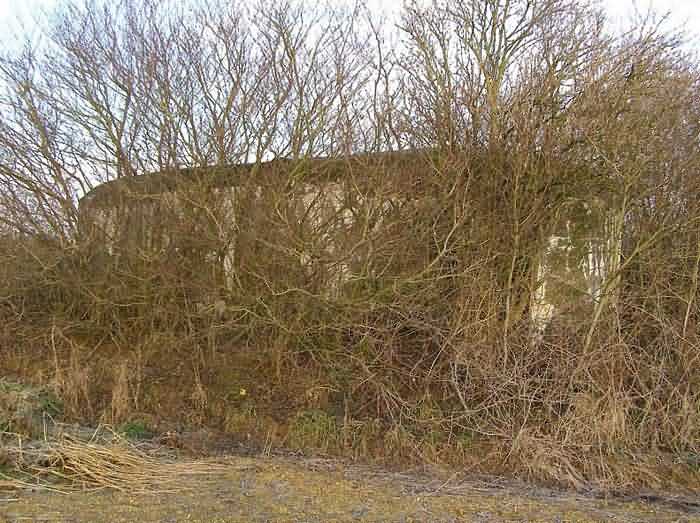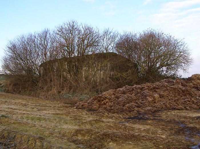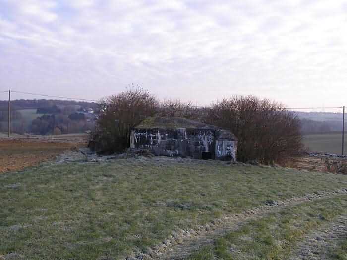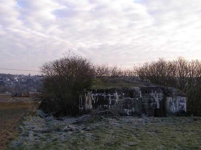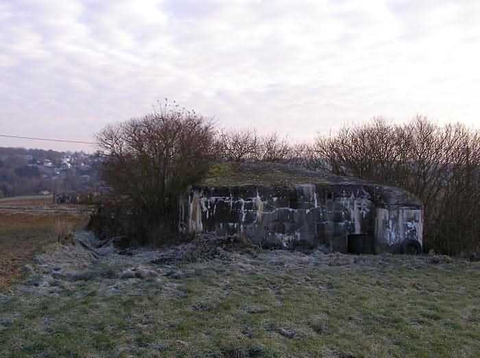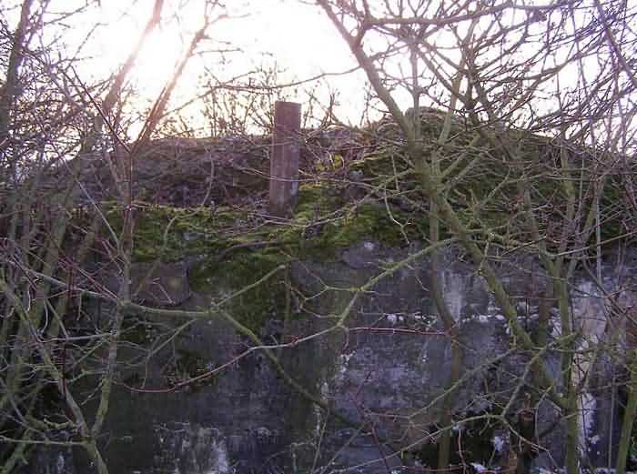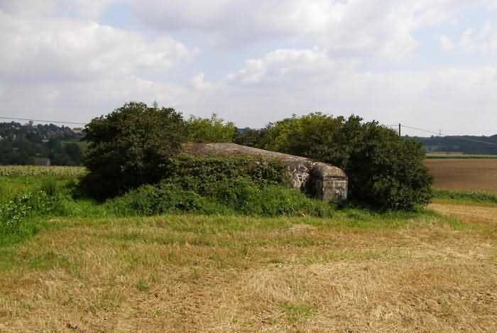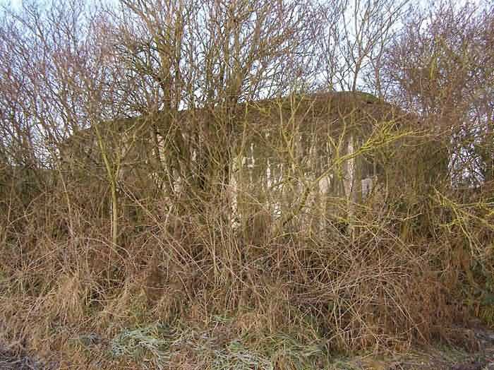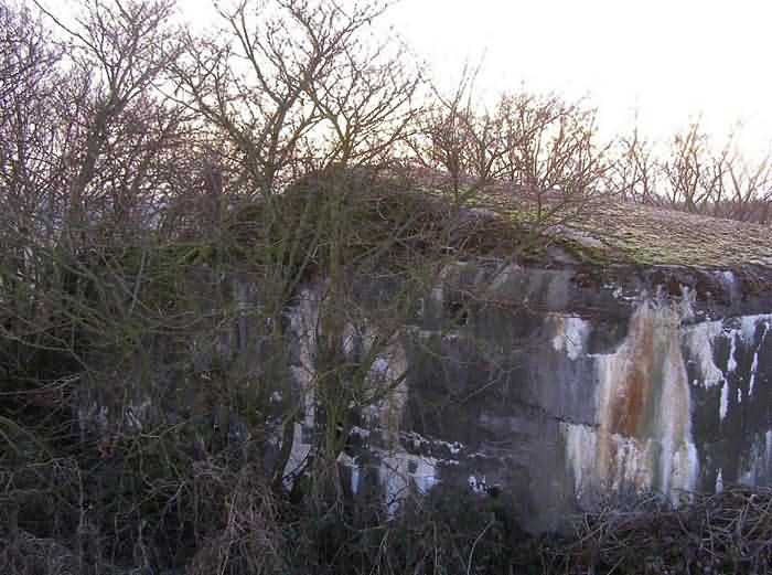 Belgian fortifications of the Second World War, fortified position of Namur, Maizeret - Marchovelette interval, first advanced line of resistance, shelter MM 33bis (Gelbressée), 187 m/asl. Located in a field under a clump of trees and dense, persistent vegetation, very close to the western edge of Rue de Warlet, where it begins to be called Rue des Bigarreaux, municipality of Gelbressée, entity of Namur, 120 m east-southeast of shelter MM 33 (Ville en Waret), it is a double flanking interval shelter with two embrasures for a machine gun on the side opposite the entrance, which has an airlock defended by a firing loophole for a light machine gun without mount. The firing room farthest from the shield has an emergency exit. On the roof slab it carried an armored cupola for lookout and light machine gun, torn off by scrap metal scavengers.