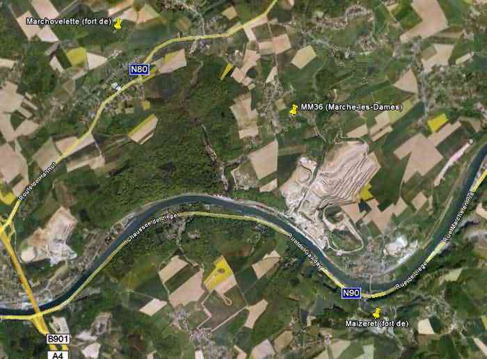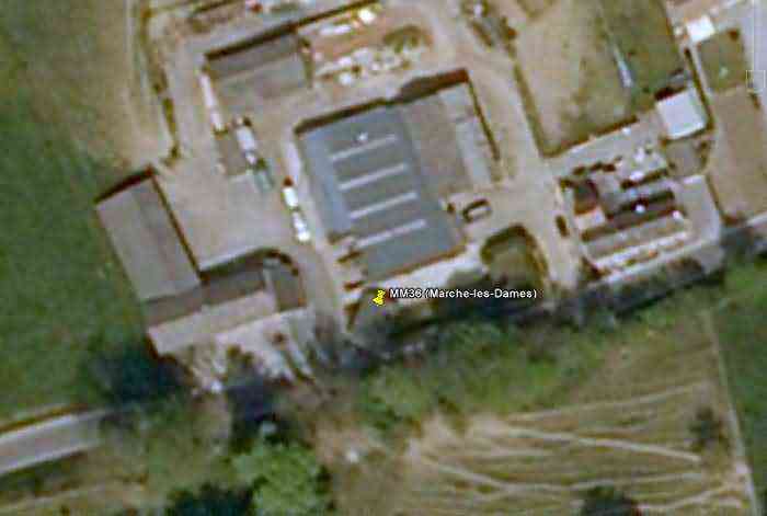 Belgische Befestigungen des Zweiten Weltkriegs, befestigte Stellung Namur, Intervall Maizeret - Marchovelette, erste vorgeschobene Widerstandslinie, Unterstand MM 36 (Marche-les-Dames), 164 M/ü M. Gelegen an der 9 Rue aux Ruwales, Dorf Wartet, Gemeinde Marche-les-Dames, Entität Namur, 240 m südöstlich des Unterstandes MM 35a (Marche-les-Dames), im Vorhof eines landwirtschaftlichen Betriebes, so nah am Straßenrand, dass eine Ecke beim Straßenausbau abgeschnitten werden musste. Es handelt sich um einen einfachen flankierenden Intervallunterstand mit einer Schießscharte für ein Maschinengewehr, verschwunden, in der ebenfalls verschwundenen Fassade gegenüber dem Kellereingang, ausgestattet mit einer Schleuse, die durch eine Schießscharte für ein leichtes Maschinengewehr ohne Lafette verteidigt wird. Die Reste des Unterstandes sind hübsch mit Ziegeln und Bruchsteinen verkleidet sowie mit einer leicht überstehenden Dachplattform, um ein ziviles Nebengebäude zu imitieren, alles, außer dem Eingang, teilweise von Kletterefeuf verdeckt. Dient offensichtlich als Schuppen für seinen Besitzer.