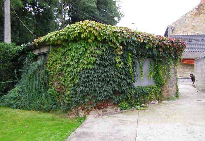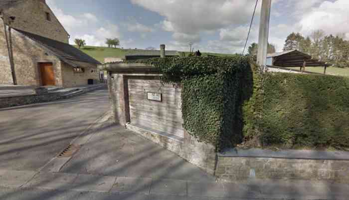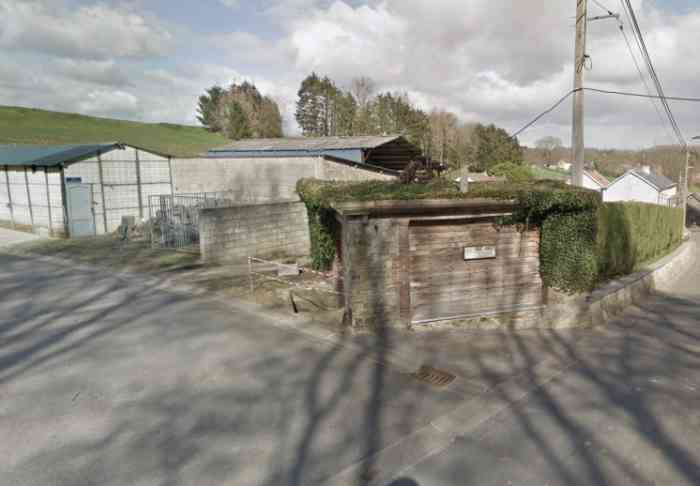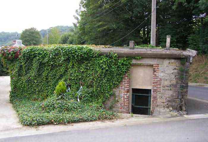 Belgian fortifications of the Second World War, fortified position of Namur, Maizeret - Marchovelette interval, first advanced line of resistance, shelter MM 36 (Marche-les-Dames), 164 m/asl. Located at 9 Rue aux Ruwales, village of Wartet, municipality of Marche-les-Dames, entity of Namur, 240 m southeast of shelter MM 35a (Marche-les-Dames), in the front yard of a farm, so close to the roadside that a corner had to be cut during road development. It is a simple flanking interval shelter with an embrasure for a machine gun, disappeared, in the also disappeared facade opposite the cellar entrance, provided with an airlock defended by a firing loophole for a light machine gun without mount. The remains of the shelter are nicely dressed with bricks and rubble stone as well as a slightly overhanging roof platform to imitate a civilian outbuilding, all, except the entrance, partially hidden by climbing ivy. Clearly serves as a shed for its owner.