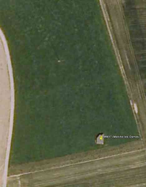Fortifications belges de la deuxième guerre mondiale, position fortifiée de Namur, intervalle Maizeret - Marchovelette, première ligne de résistance avancée, abri MM 37 (Marche-les-Dames), 176 m/alt. Situé dans les champs, dans un chemin agricole débouchant Rue aux Vallées, il s’agit d’un abri d’intervalle simple flanquant avec une embrasure pour une mitrailleuse, une entrée dotée d’un sas défendu par un créneau pour un fusil-mitrailleur sans affût et une goulotte lance grenades dans la façade opposée au bouclier. Bien qu’étant le plus proche, il est quand même distant du fort de Maizeret de 3 600 m avec entre les deux la carrière de dolomies de Naméche, connue sous le nom de « Dolomies de Marche-les-Dames » ainsi que par la vallée de la Meuse profondément encaissée. Il est dans un état de conservation correct.