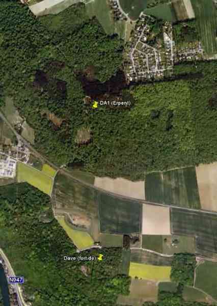 Befestigte Stellung Namur, Intervall Dave - Andoy, zweite Widerstandslinie, Unterstand 1 von Erpent, 204 M/ü M. Gelegen am nordwestlichen Ende der zweiten Widerstandslinie, im Wald, der 50 m über der Eisenbahnlinie Jambes-Nanines liegt, in Erpent, es handelt sich um einen Intervallunterstand mit einer Schießscharte für ein Maschinengewehr oder eine Panzerabwehrkanone, dessen Außenwände löffelartig getarnt sind und dessen alle Öffnungen zugemauert sind. Er ist im Winter leichter zu finden, obwohl er nicht besonders von Vegetation überwuchert ist.