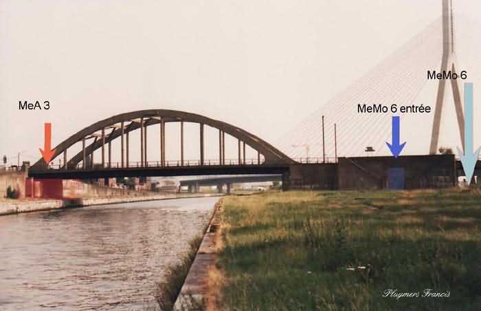 Position Fortifiée de Liège, quatrième ligne de résistance, abris de l'île Monsin et des ponts de Meuse, abri MeMo6, 57 m/alt. Situé sur le musoir séparant la Meuse du canal Albert, à 95 m à l'est de l'abri MeA3, dans l'une des piles centrales de l'ancien pont de Wandre. Détruit.