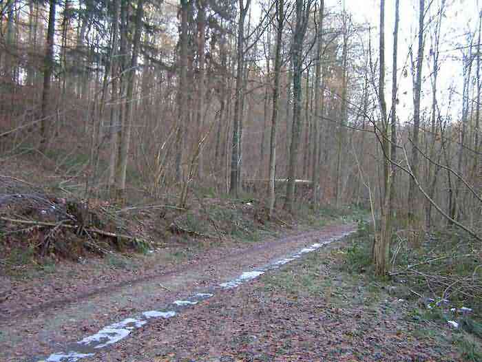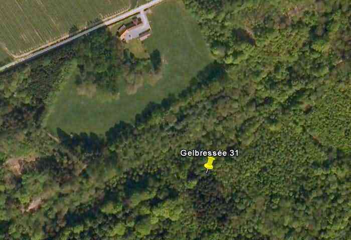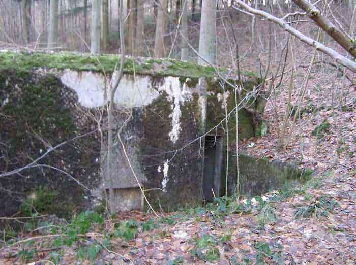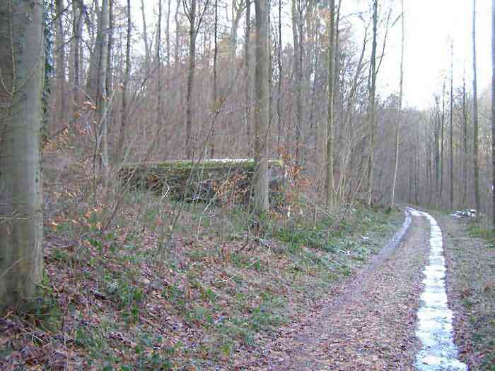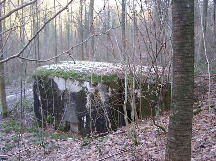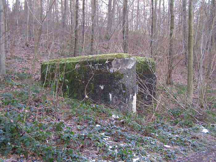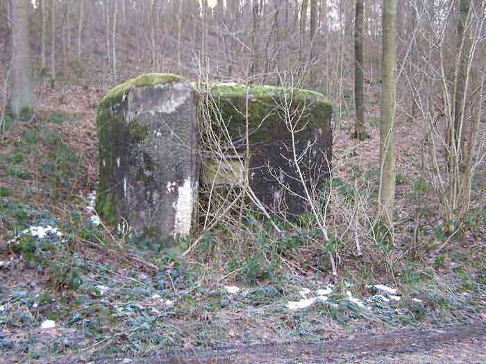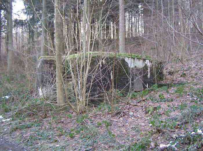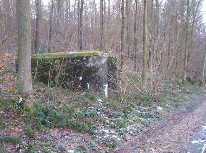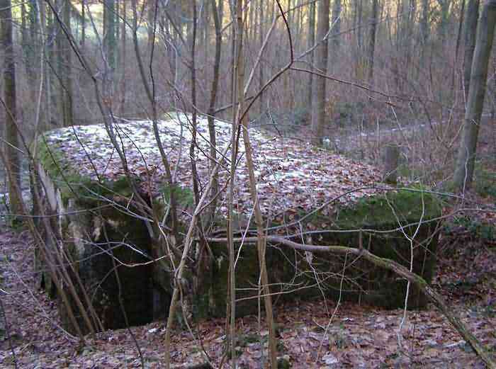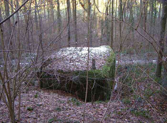Belgian fortifications of the Second World War, fortified position of Namur, Maizeret - Marchovelette interval, first advanced line of resistance, shelter MM 31 (Franc-Waret), 186 m/asl. Located in the woods southwest of Franc-Waret, on a forest path, it is a simple flanking interval shelter with an embrasure for a machine gun, an entrance on the side opposite the shield provided with an airlock defended by a firing loophole for a light machine gun without mount, and an emergency exit in the firing room.