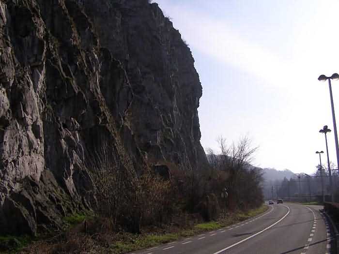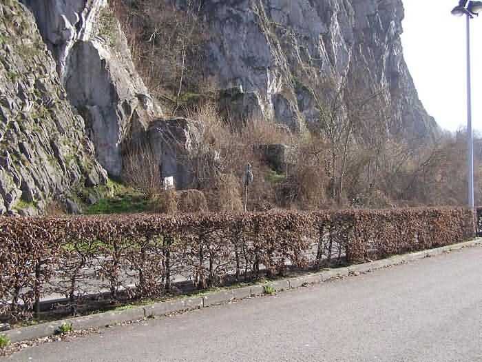 Befestigte Stellung Namur, Intervall Saint-Héribert - Dave, Unterstand 6d von Dave, 85 M/ü M. Gelegen am Ufer der Maas, linkes Ufer, zwischen der Straße und der Felswand, rechts vom Felsen. Es handelt sich um einen Intervallunterstand mit einer Schießscharte für ein Maschinengewehr oder eine Panzerabwehrkanone auf Feldlafette. Er verfügt noch über einige Haken und seine Konsolen zum Aufstellen der Regale. Struktureller Zustand noch völlig akzeptabel. Das Innere der Konstruktion ist gesund, aber der Boden ist mit diversem Bauschutt und Abfall übersät.