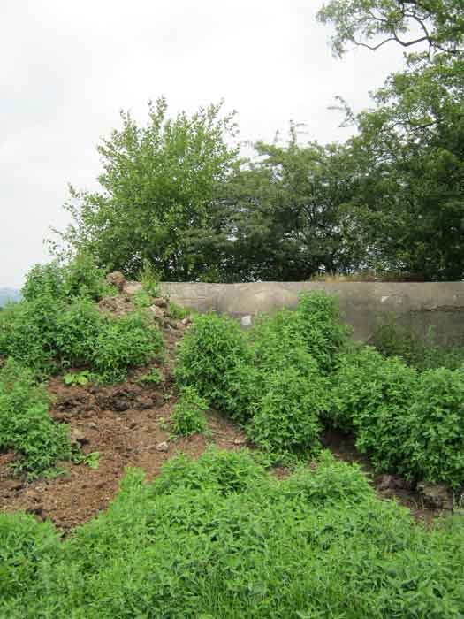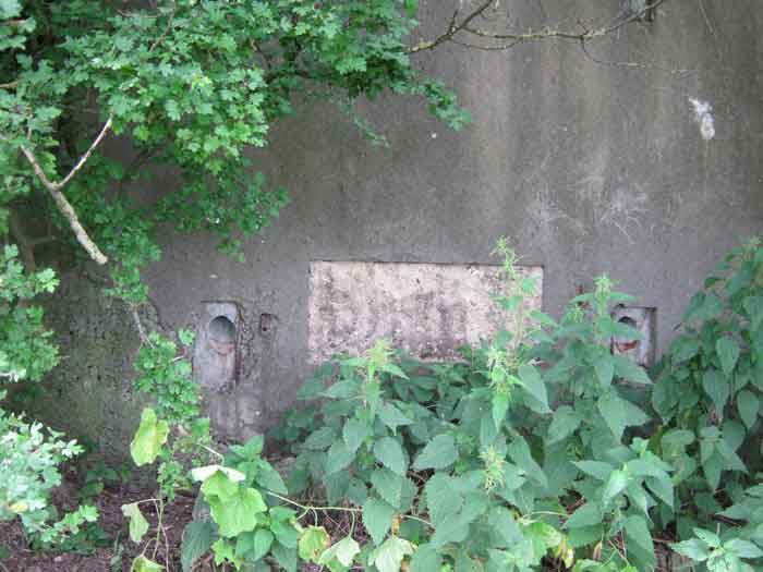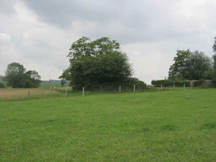 Belgian fortifications from the Second World War, fortified position of Liège, first line of resistance, interval Manaihant-Margarins, shelter MM 18. MM 18 is located in a meadow, 50 m from Fastré, it covered the south of Margarins. The embrasure for a pivoting shutter is walled up. The entrance is filled with green waste from the neighbourhood. Intended for an FRC mount, the DN (National Defence) boundary stones, the concrete posts of the fence, the small access grid gate to the military compound and the embrasure shutter have disappeared.