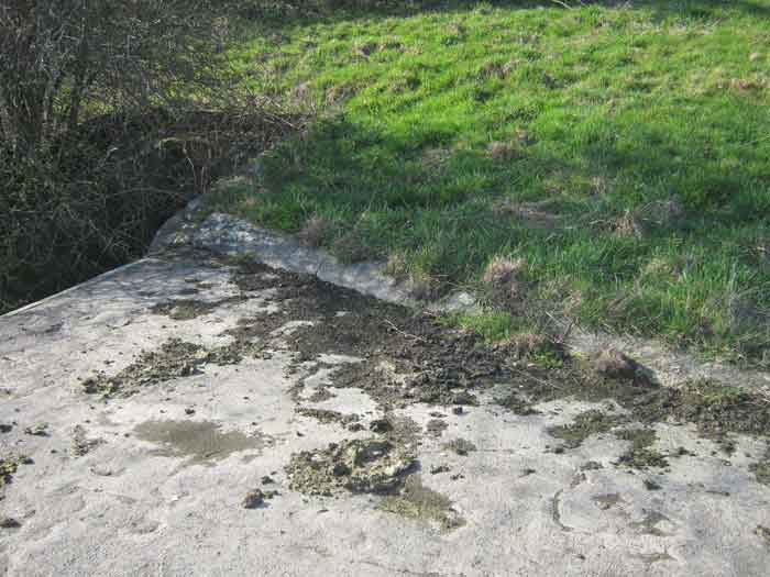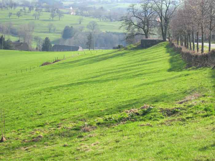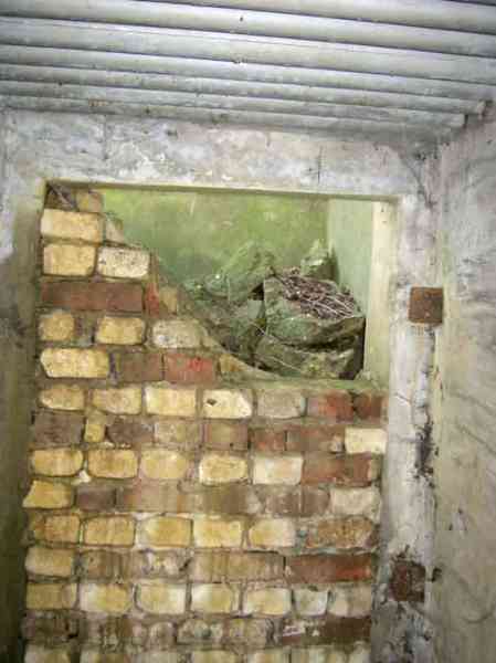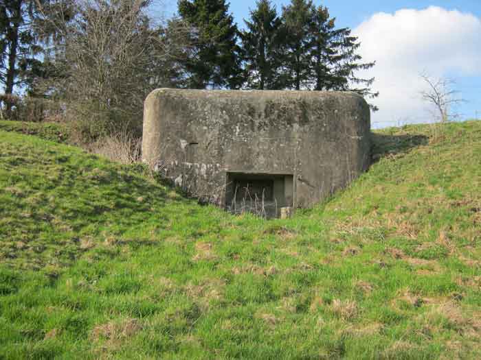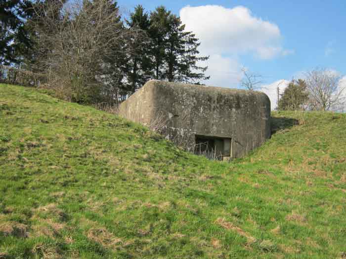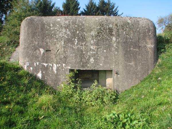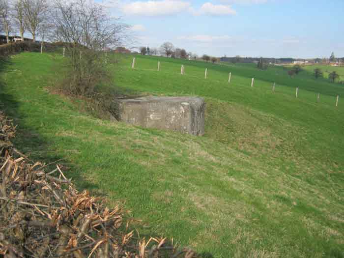 Belgian fortifications of the Second World War, fortified position of Liège, first resistance line, shelter of the Margarins-Neufchâteau interval. MN 20 is located below the road from Saint-Jean-Sart to road N 608. It crossed its fire with MN 19, from which it is 200 m distant. It covered the slope in the direction of the Aubel–Val-Dieu road. This work has a cellar entrance partially backfilled with rubble and concrete blocks. The entrance is not placed in the recess of the airlock but opposite it and rather difficult to access. The embrasure is walled up and is larger than the majority of other works; it had a pivot shutter. The exterior is in good condition. The interior is in good condition and complete (some brackets for shelves and bent hooks). Chardôme mount present. A grenade launching chute without its closing flap defended the entrance. On the roof there is a concrete relief preventing the earth from sliding over the work. It still has some fence posts in its live hedge on the road side. © Francis Pluymers