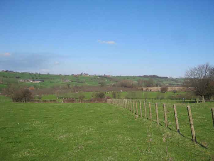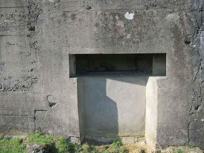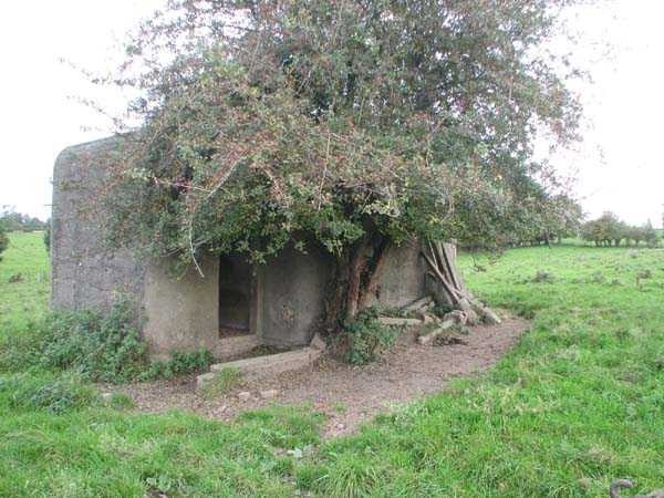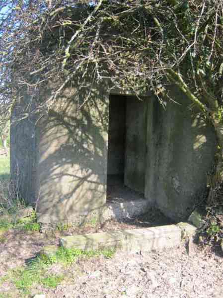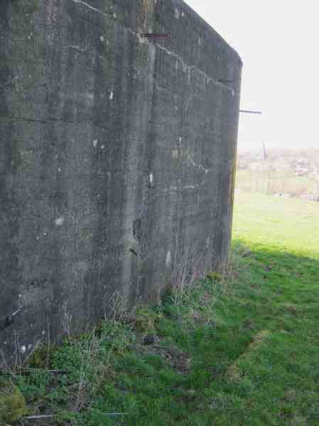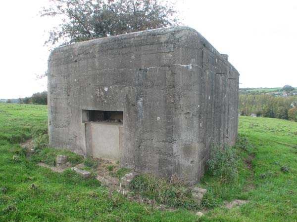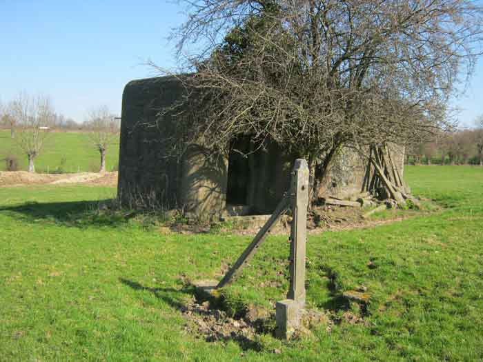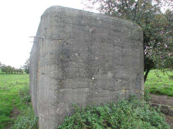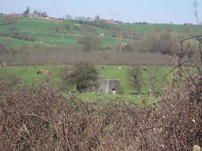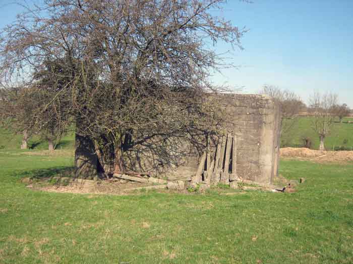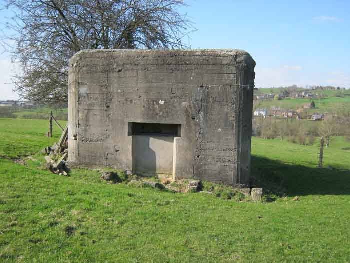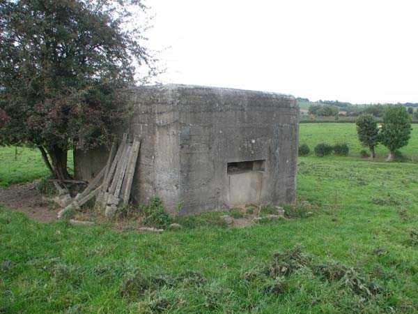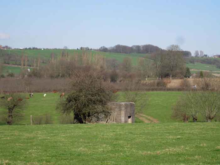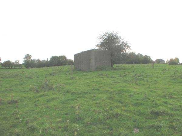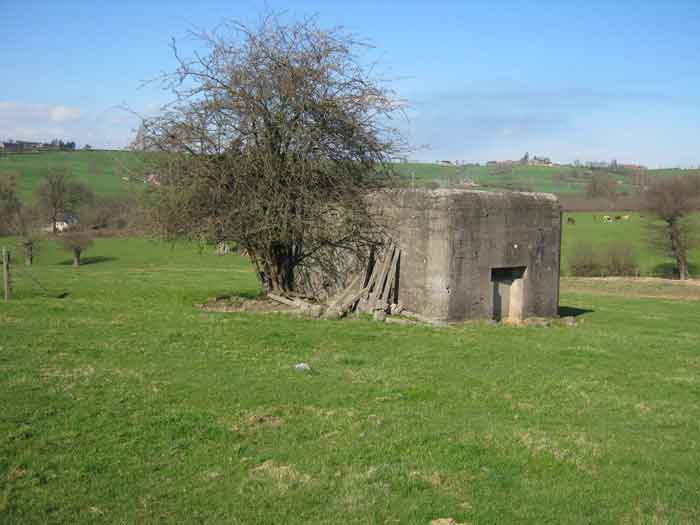 Fortifications belges de la deuxième guerre mondiale, position fortifiée de Liège, première ligne de résistance, abri de l'intervalle Margarins-Neufchâteau. MN 15 se situe au nord de MN 14 au beau milieu des prairies. Il couvrait MN 13. Cet ouvrage était entouré d’un mur de parement en briques de terre cuite. L’embrasure est fermée. L’extérieur est en bon état. L’entrée est accessible. L’intérieur est en bon état et complet. Il a un affût Chardôme. Trois goulottes lance-grenades permettent la défense rapprochée. Les poteaux de clôture en béton ont été enlevés. Il reste actuellement deux poteaux de coin avec leur borne DN (Défense Nationale) (le 2 et 3). © Francis Pluymers