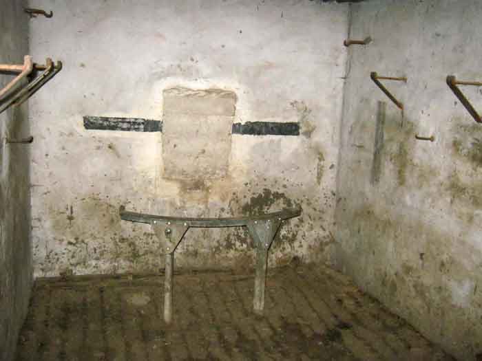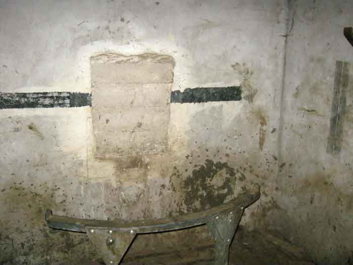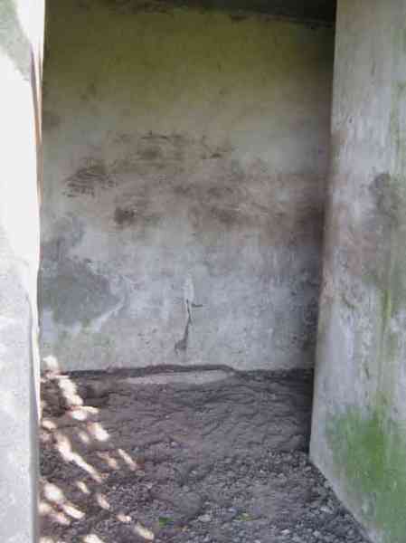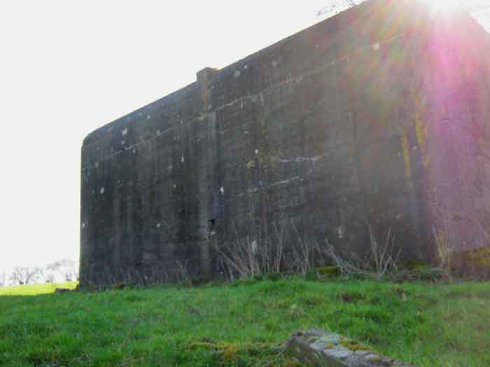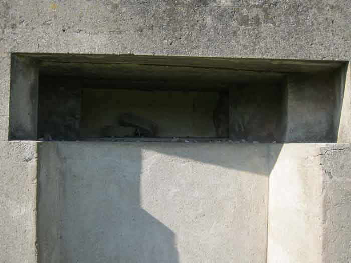 Belgian fortifications from the Second World War, fortified position of Liège, first line of resistance, shelter of the Margarins-Neufchâteau interval. MN 15 is located north of MN 14 in the middle of the meadows. It covered MN 13. This structure was surrounded by a facing wall of terracotta brick. The embrasure is closed. The exterior is in good condition. The entrance is accessible. The interior is in good condition and complete. It has a Chardôme mount. Three grenade launching chutes allow for close defense. The concrete fence posts have been removed. There currently remain two corner posts with their DN boundary stone (National Defence) (the 2nd and 3rd). © Francis Pluymers