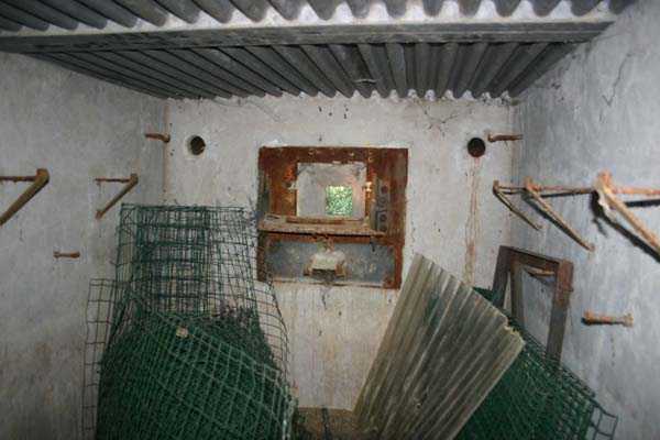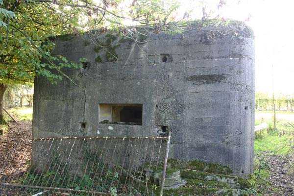 Belgian fortifications from the Second World War, fortified position of Liège, first line of resistance, shelter of the Margarins-Neufchâteau interval. MN 14 is located on the edge of the Bushaye road at the level of an old farm, 150 m from MN 13, on private property. It fired northeast towards the chapel of St-Roch and covered MN 15. This structure was surrounded by a facing wall of terracotta brick. The embrasure is open. The exterior is in good condition. The entrance is accessible but was denied to me by the owner, reason « it's private ». Judging by the photos from Andréas, the interior appears to be in good condition and complete with the brackets for the shelves, the L3 hooks for personal weapons, the L2 hooks for personal equipment, the fitting for the L1 hook of the Coleman lamp, apparently without the hook. The fixing shelf for the cartridge hopper is not visible in the photos. It had an FRC mount, of which only the wall plate remains. According to the photos, there must be a chute for the entrance and another for the right flank. It still has for the moment a corner post with its DN boundary stone (National Defence) as well as some fence posts.