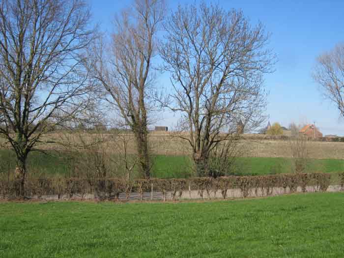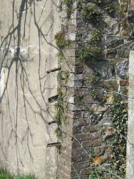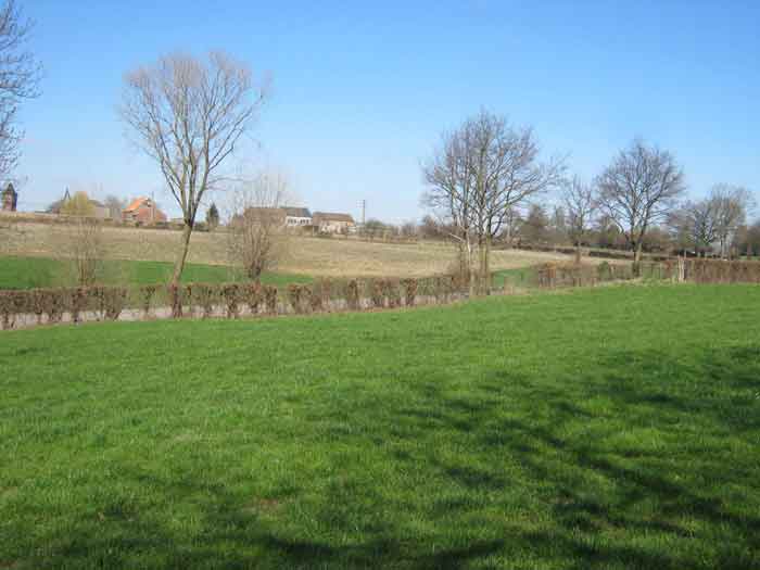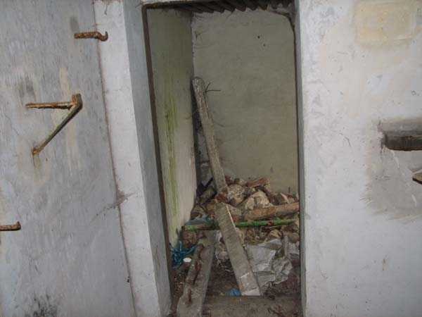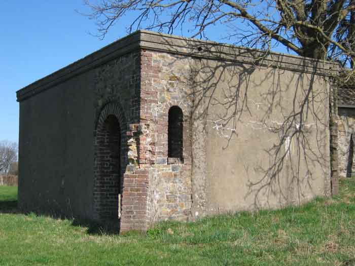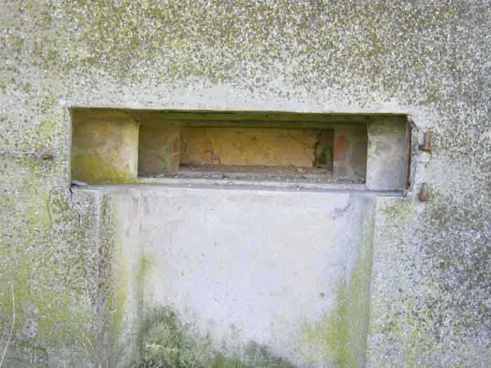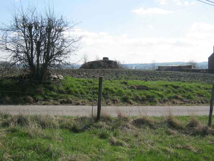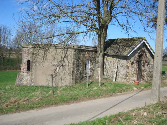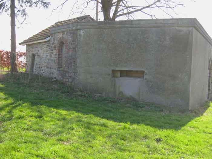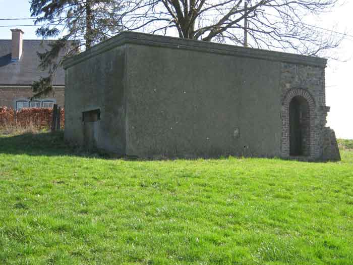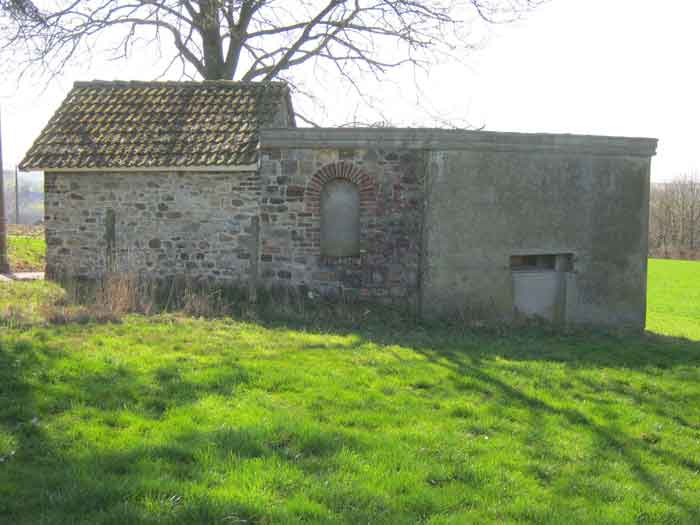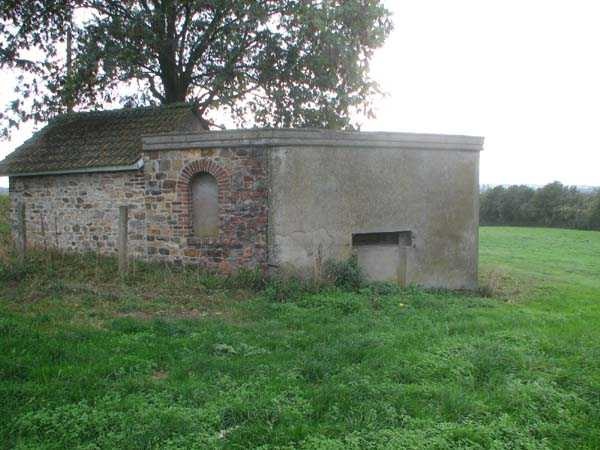 Belgian fortifications from the Second World War, fortified position of Liège, first line of resistance, shelters of the Margarins-Neufchâteau interval. MN 12 is located at the place called “Le Macra” on the edge of the path, leading to the observation post MN 11. It covered the road coming from Aubel at the height of Gorhez thus crossing its fire with MN 13 350 m away. This structure, without a fence and without DN boundary stones (National Defence), has a particular camouflage, the entrance as well as certain wall sections have the same stones as the chapel of Sainte Lucie to which it is attached. The concrete parts were supposed to be painted in stone imitation (at the embrasure, traces of this pattern can still be seen). The embrasure is walled up and had a pivoting shutter. The exterior is in good condition. The concrete posts of the fence are in the entrance airlock. It had a Chardôme mount whose support is still present. The interior is complete with its shelf brackets, its L3 hooks for personal weapons, L2 for the personal equipment of the personnel, L1 and its fitting for the Coleman lamp, its shelf for the cartridge hopper, its PR mark, except for the P1 entrance gate, the louvered door P2 and the flaps for the grenade launching chutes. A grenade launching chute defended the entrance, another the left flank.