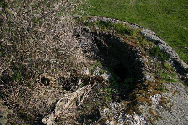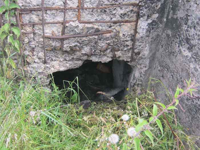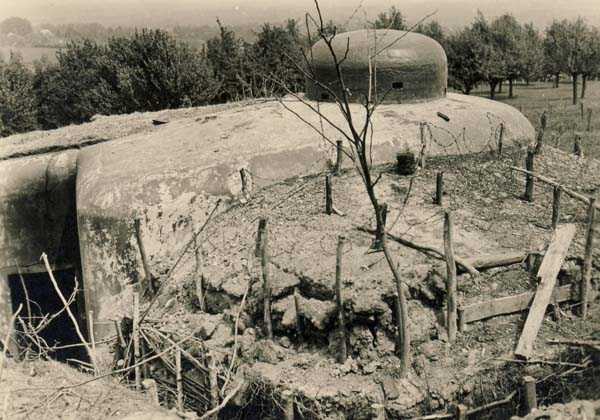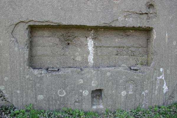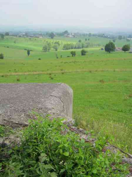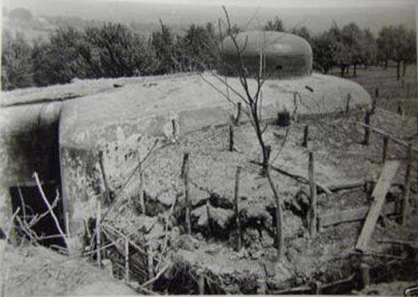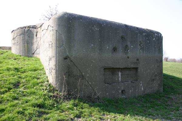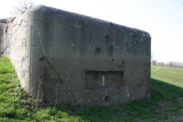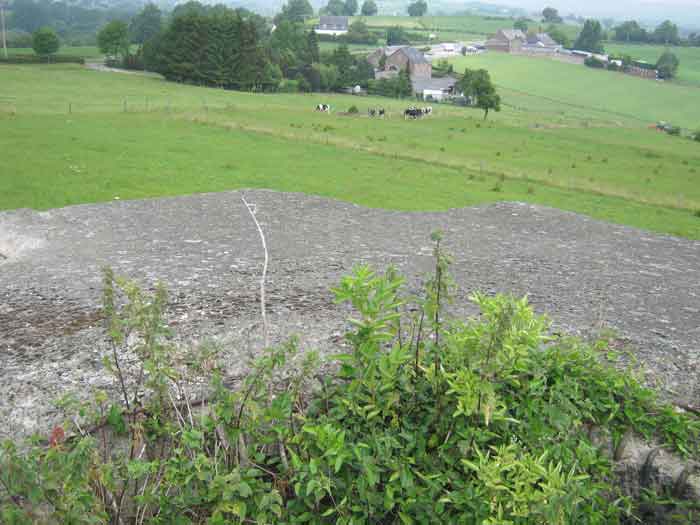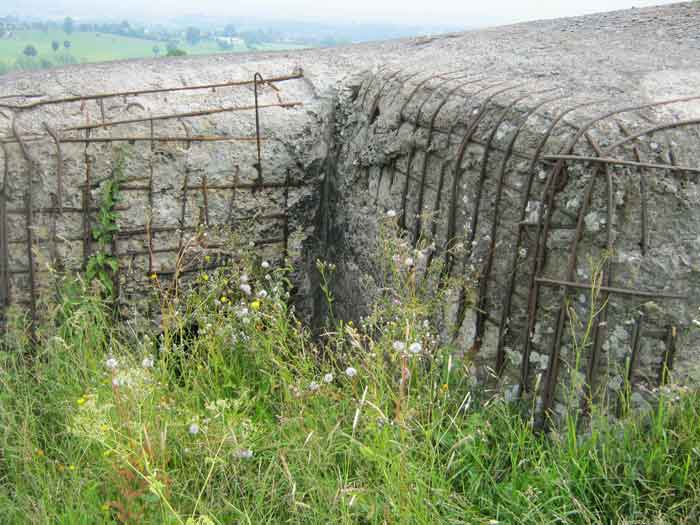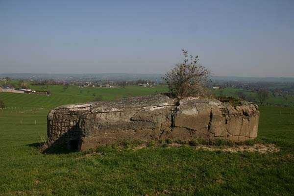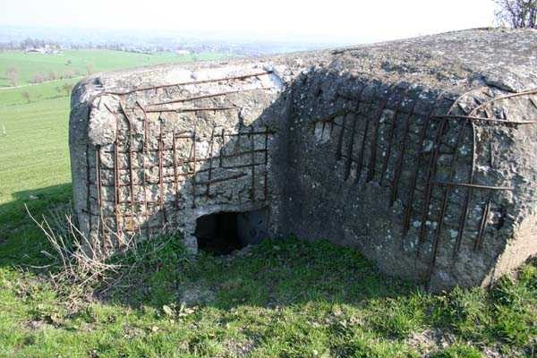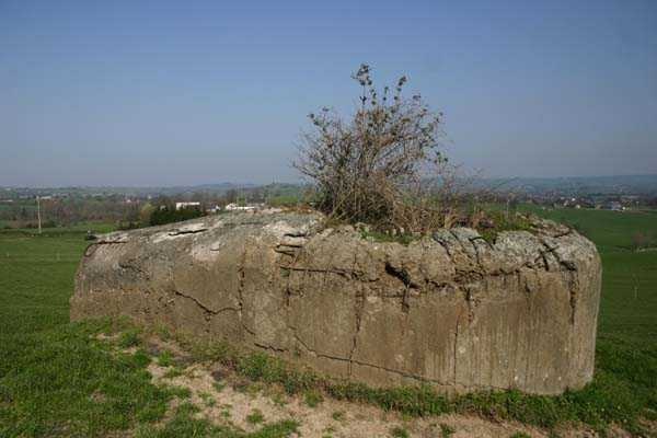Belgian fortifications from the Second World War, fortified position of Liège, first line of resistance, interval Manaihant-Margarins, shelter MM 12. MM 12 is an armoured shelter responsible for observing the Aubel sector on behalf of the fort of Battice. It is located in a meadow, 150 m from the Battice-Aubel road and 500 m north of the fort. It consists of an airlock, a rest room and a second room at the foot of the SOM cupola (the latter is almost filled with earth). It was defended by two grenade launching chutes, one at the embrasure defending the most exposed side, the other defending the entrance. The exterior and interior condition is good despite its many wartime «wounds». The interior is blackened, many fittings and hooks have disappeared. MM12 was harassed relentlessly. The crew of the structure fulfilled its mission until it was put out of service on May 19 around 9 p.m. by a charge of explosives, which tore off the armoured door. It can be assumed that it is the louvered door P2 (given the damage caused to the concrete). No casualties are to be deplored thanks to the presence of an additional room.