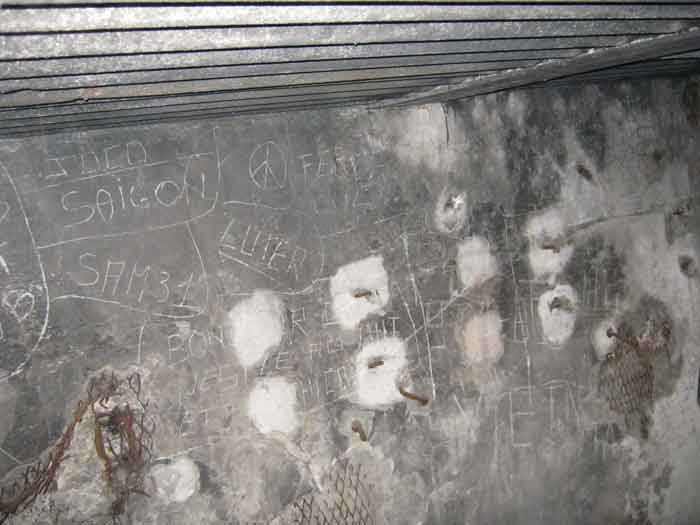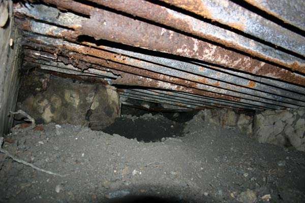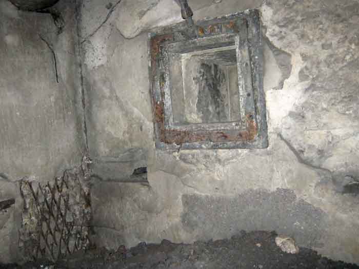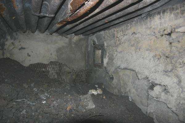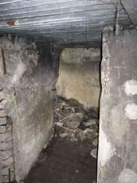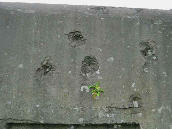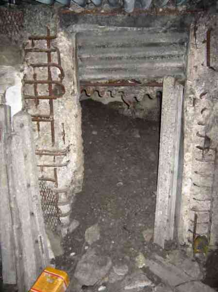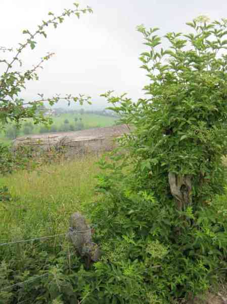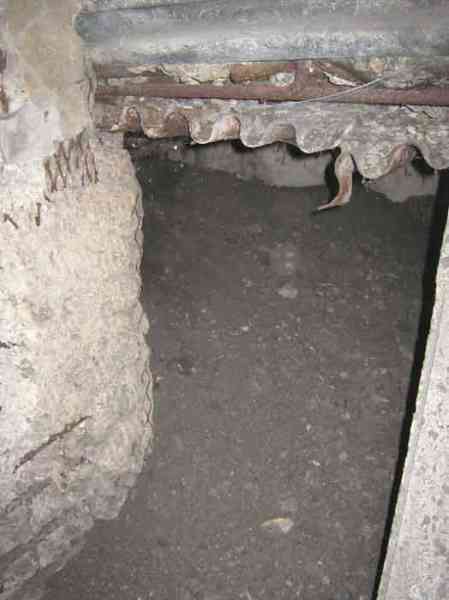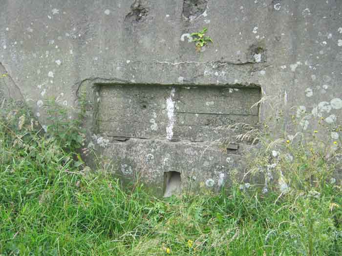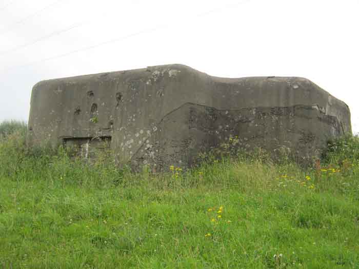Belgian fortifications from the Second World War, fortified position of Liège, first line of resistance, interval Manaihant-Margarins, shelter MM 12. MM 12 is an armoured shelter responsible for observing the Aubel sector on behalf of the fort of Battice. It is located in a meadow, 150 m from the Battice-Aubel road and 500 m north of the fort. It consists of an airlock, a rest room and a second room at the foot of the SOM cupola (the latter is almost filled with earth). It was defended by two grenade launching chutes, one at the embrasure defending the most exposed side, the other defending the entrance. The exterior and interior condition is good despite its many wartime «wounds». The interior is blackened, many fittings and hooks have disappeared. MM12 was harassed relentlessly. The crew of the structure fulfilled its mission until it was put out of service on May 19 around 9 p.m. by a charge of explosives, which tore off the armoured door. It can be assumed that it is the louvered door P2 (given the damage caused to the concrete). No casualties are to be deplored thanks to the presence of an additional room.