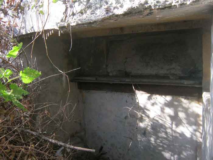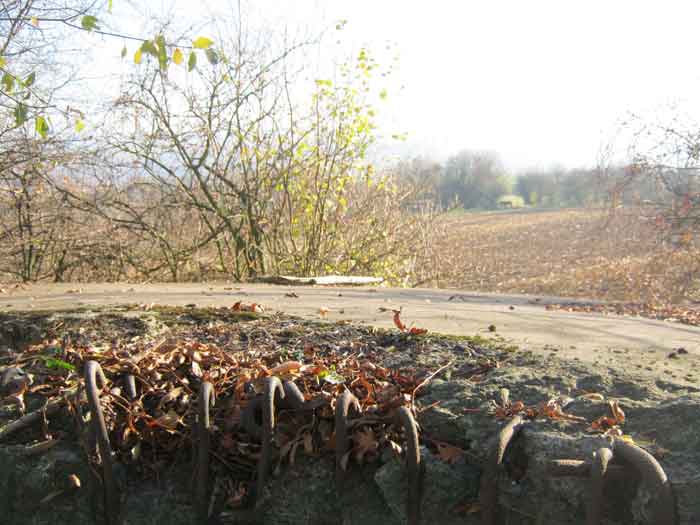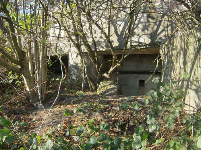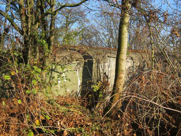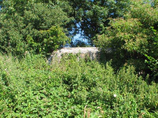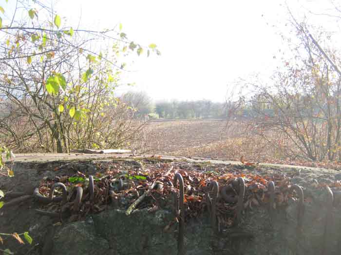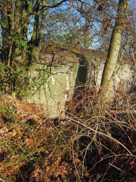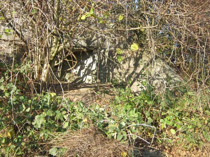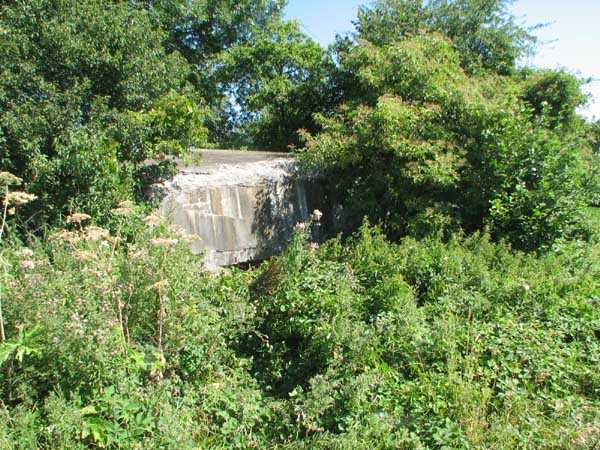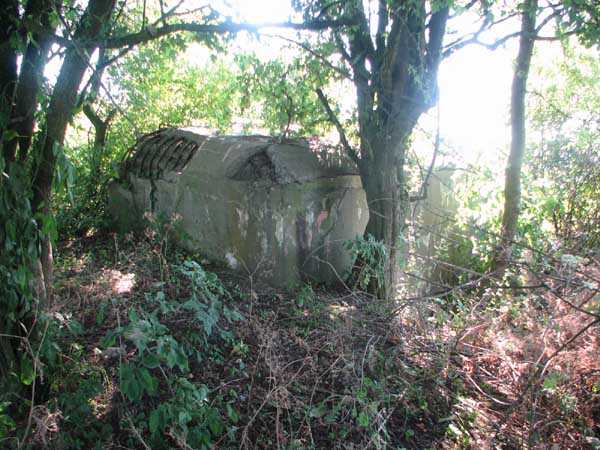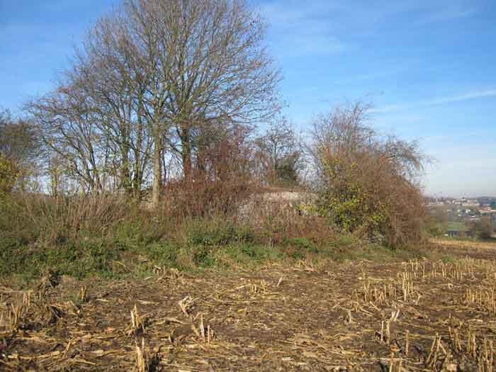 Belgian fortification of the Second World War, Fortified Position of Liège, advanced post of Magnée. Shelter Mg 4 is located at the end of Rue de la Carrière in the field on the left. This is the northernmost shelter of the FPL 2 type of the Magnée position. It was converted into an observation post for the fort of Fléron. It has a view ranging from the Carrefour supermarket in Fléron to the heights of Forêt via Ayneux. One of the firing chambers was converted into a relaxation room and fitted with a grenade launcher chute and an observation cupola, the other covered the old footpath coming from Bay Bonnet. Chardome mount, I saw no trace of the clay tray. The exterior, serving as a green waste dump, and the interior are in good condition. Some waste, such as an empty bottle, cans and a margarine tub, litter the floor. Most of the attachments have been cut off. Access to the shelter is very difficult, the opening is very narrow. I can say that this is one of the shelters I had the most difficulty getting out of (not recommended for stout persons). Its observation cupola was torn off by a scrap dealer who would have done better to do it elsewhere.