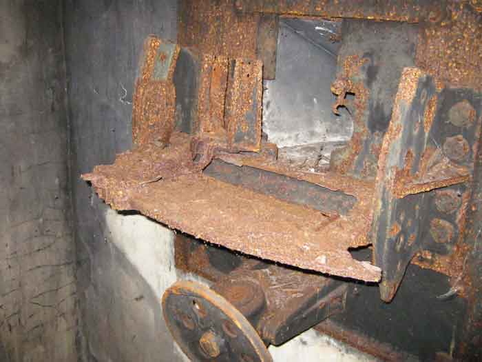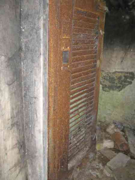 Belgian fortifications from the Second World War, fortified position of Liège, first line of resistance, interval Manaihant-Margarins, shelter MM 4. Shelter MM 4 is located 230 m northeast of MM 305. It is at the end of the path leading to an old farm, in the meadow behind it. It covered the village of Chaineux. It still has its fence stakes at the back of the shelter. The exterior and interior are in good condition. The embrasure with a pivoting shutter is closed. The entrance is accessible. The entrance grille P1 and the louvered door P2 are still present. The FRC mount is almost complete but heavily rusted, the threaded rod is missing. The interior is almost complete. No grenade launching chutes.